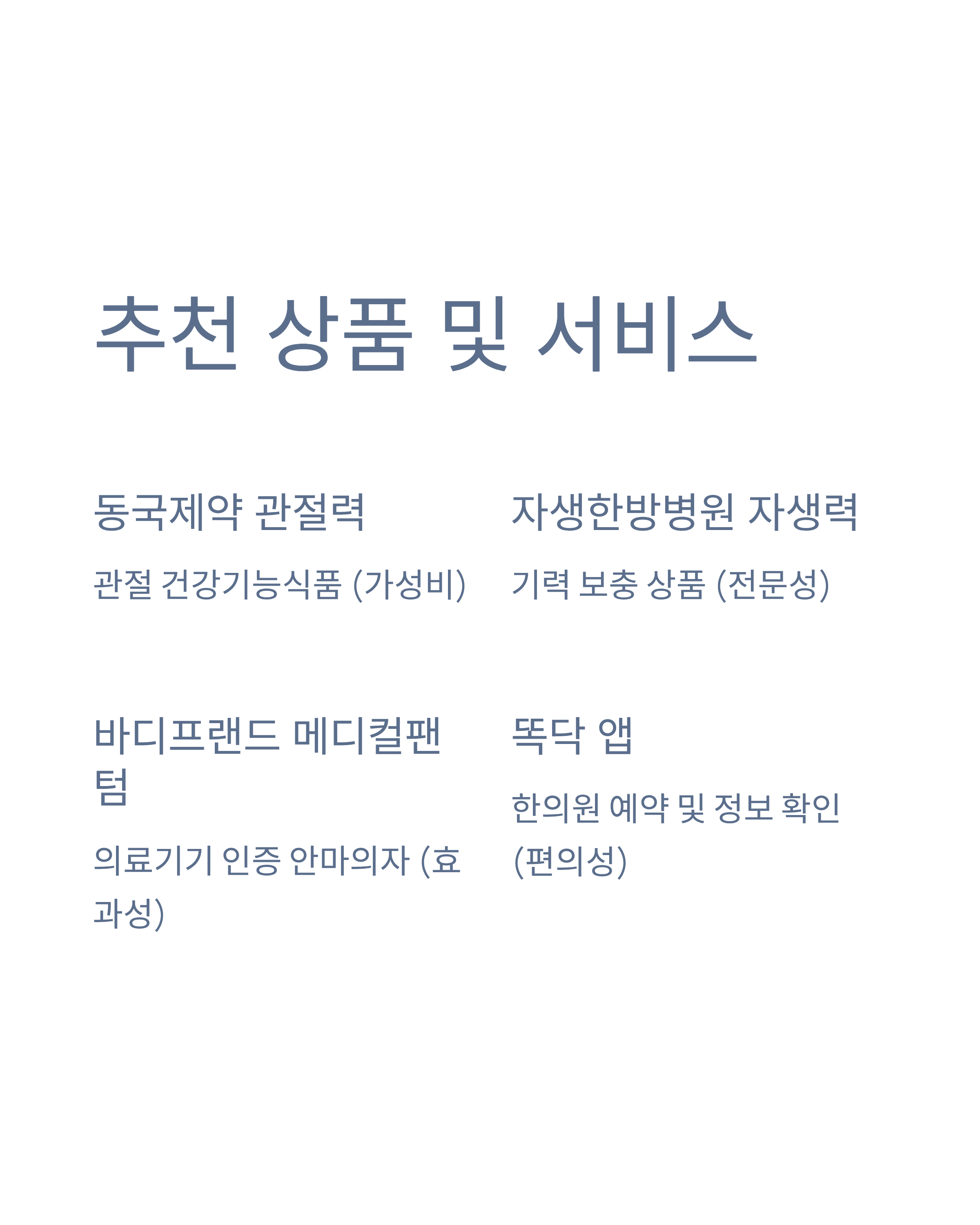 - 자생한방병원 '자생력': 한방 원리를 활용한 기력 보충 상품 및 전국 네트워크 진료. (전문성)