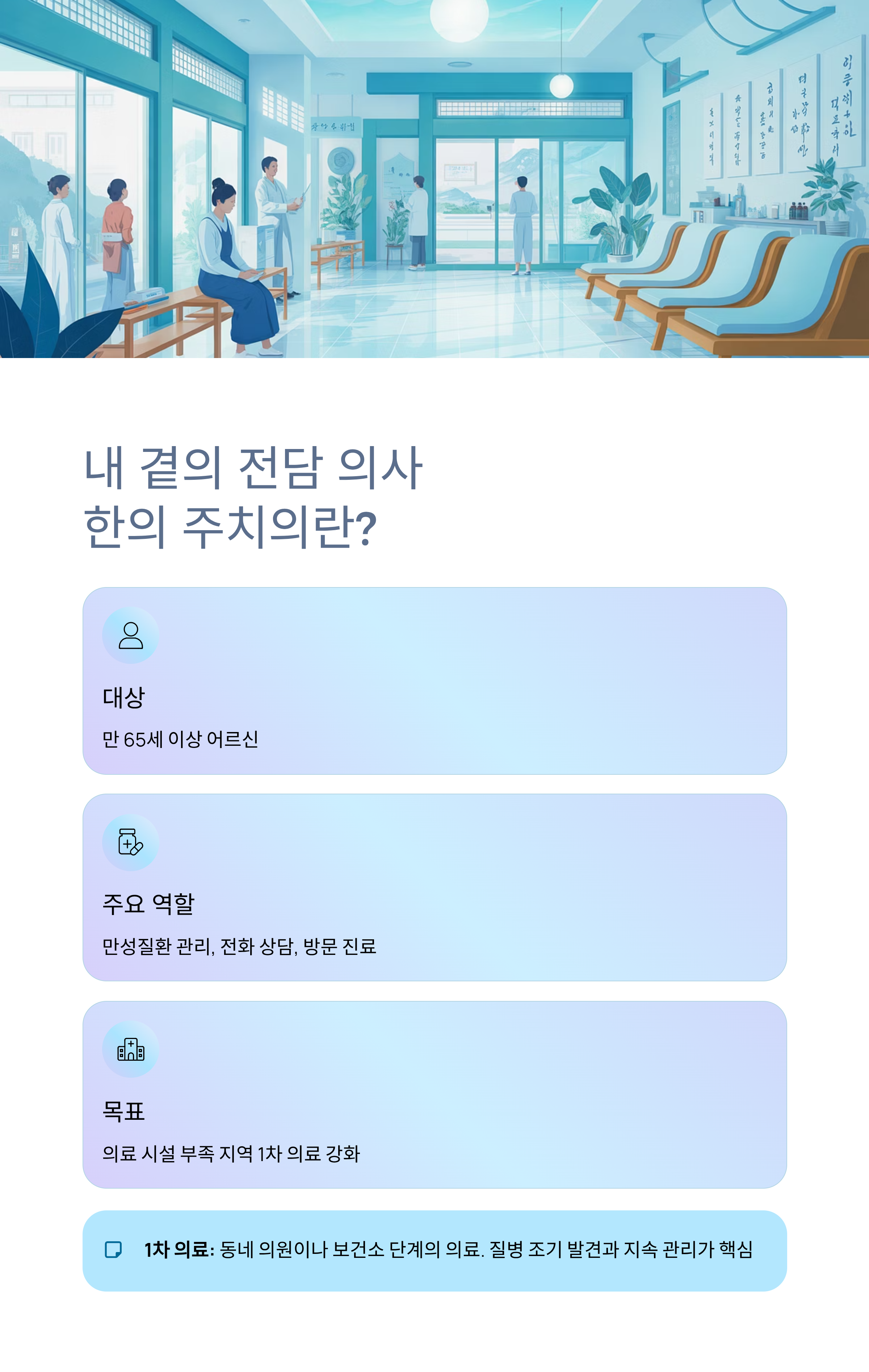 - 목표: 의료 시설이 부족한 지방이나 거동이 힘든 어르신들의 1차 의료 강화
