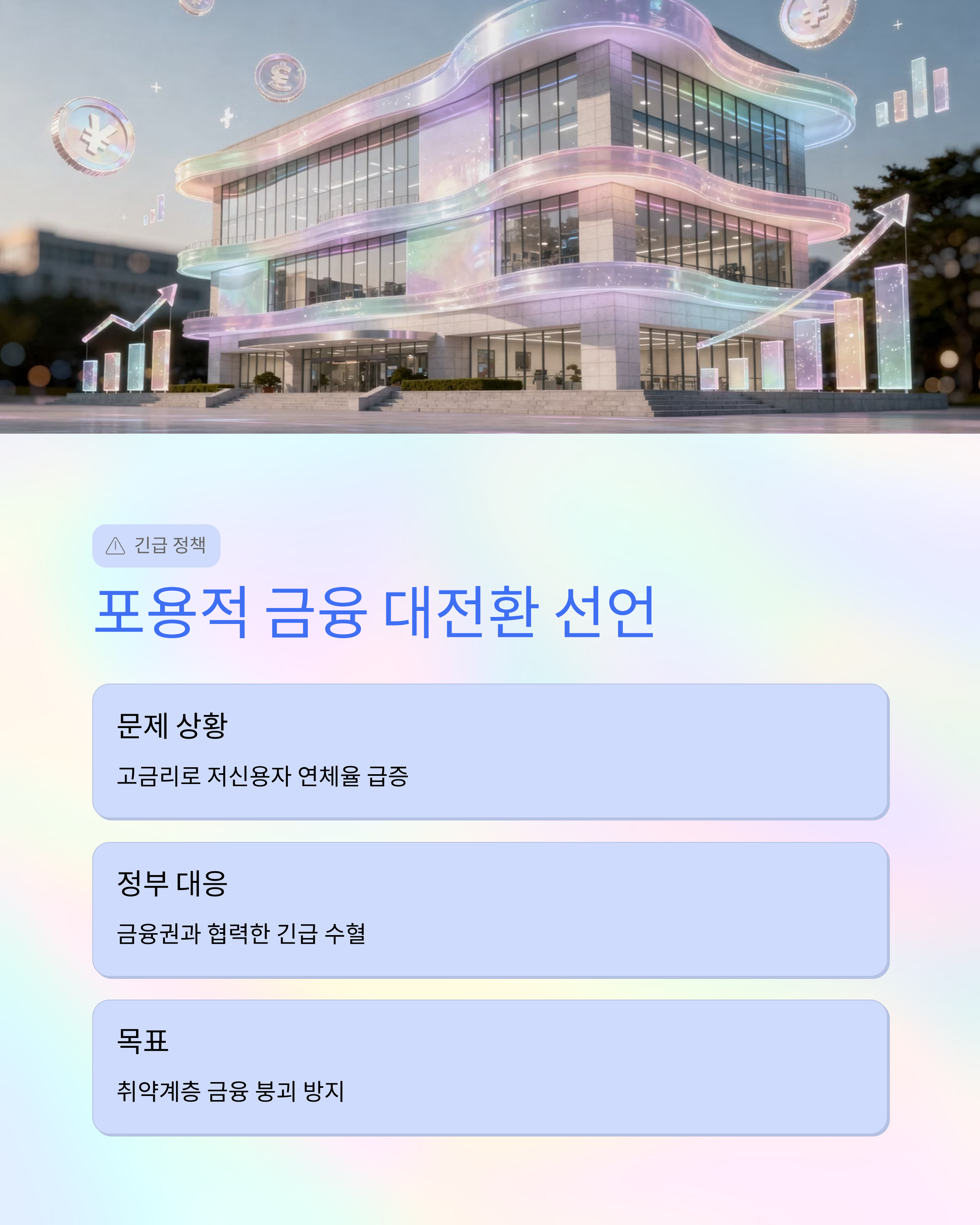고금리 상황이 지속되면서 저신용자와 소상공인의 연체율이 급증하자, 정부와 금융권이 힘을 합쳐 '포용적 금융 대전환'을 선언했어요. 이는 단순한 자금 지원을 넘어 취약계층의 붕괴를 막기 위한 긴급 수혈이라고 볼 수 있습니다.
