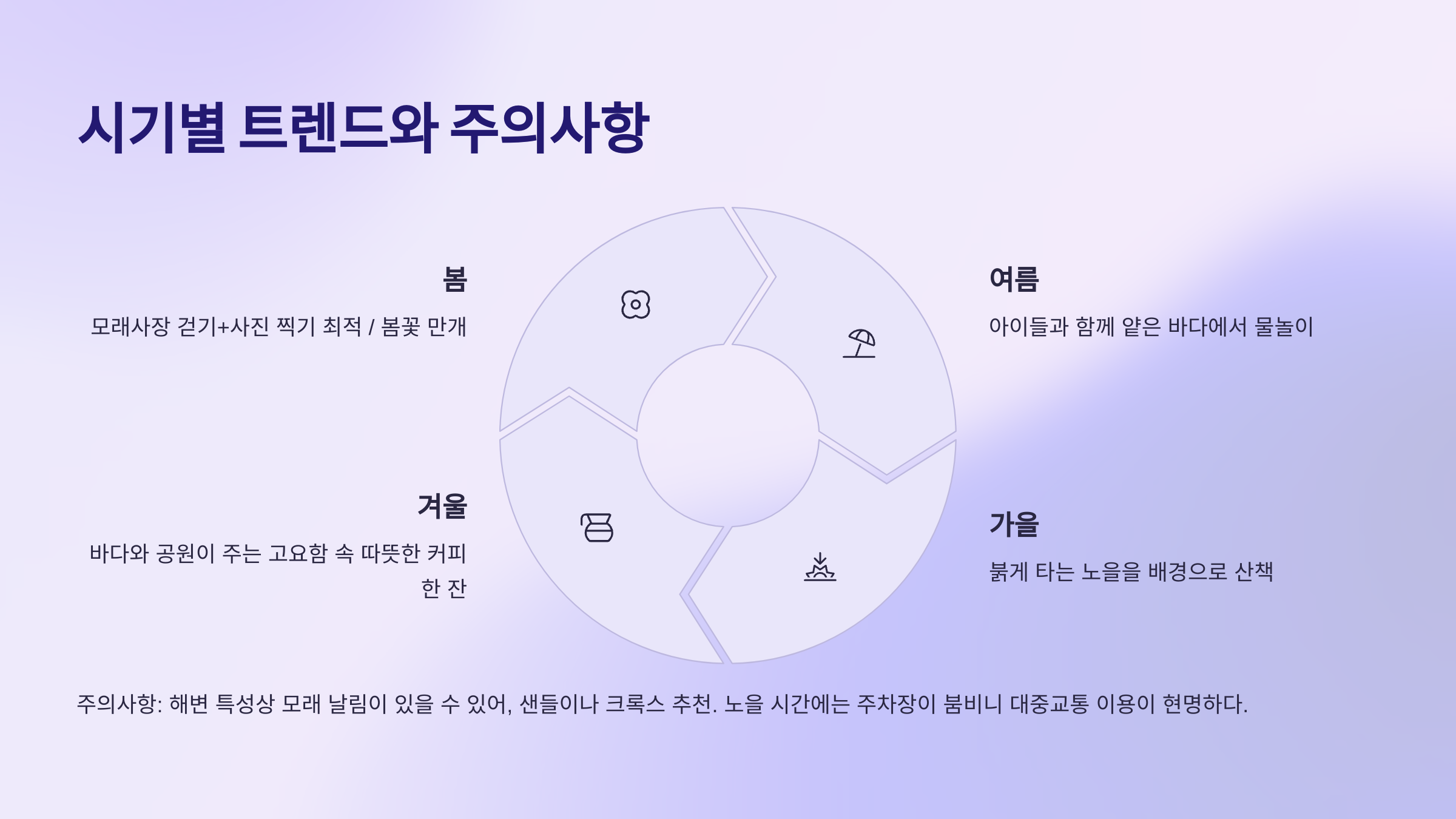주의사항: 해변 특성상 모래 날림이 있을 수 있어, 샌들이나 크록스 추천. 노을 시간에는 주차장이 붐비니 대중교통 이용이 현명하다.
