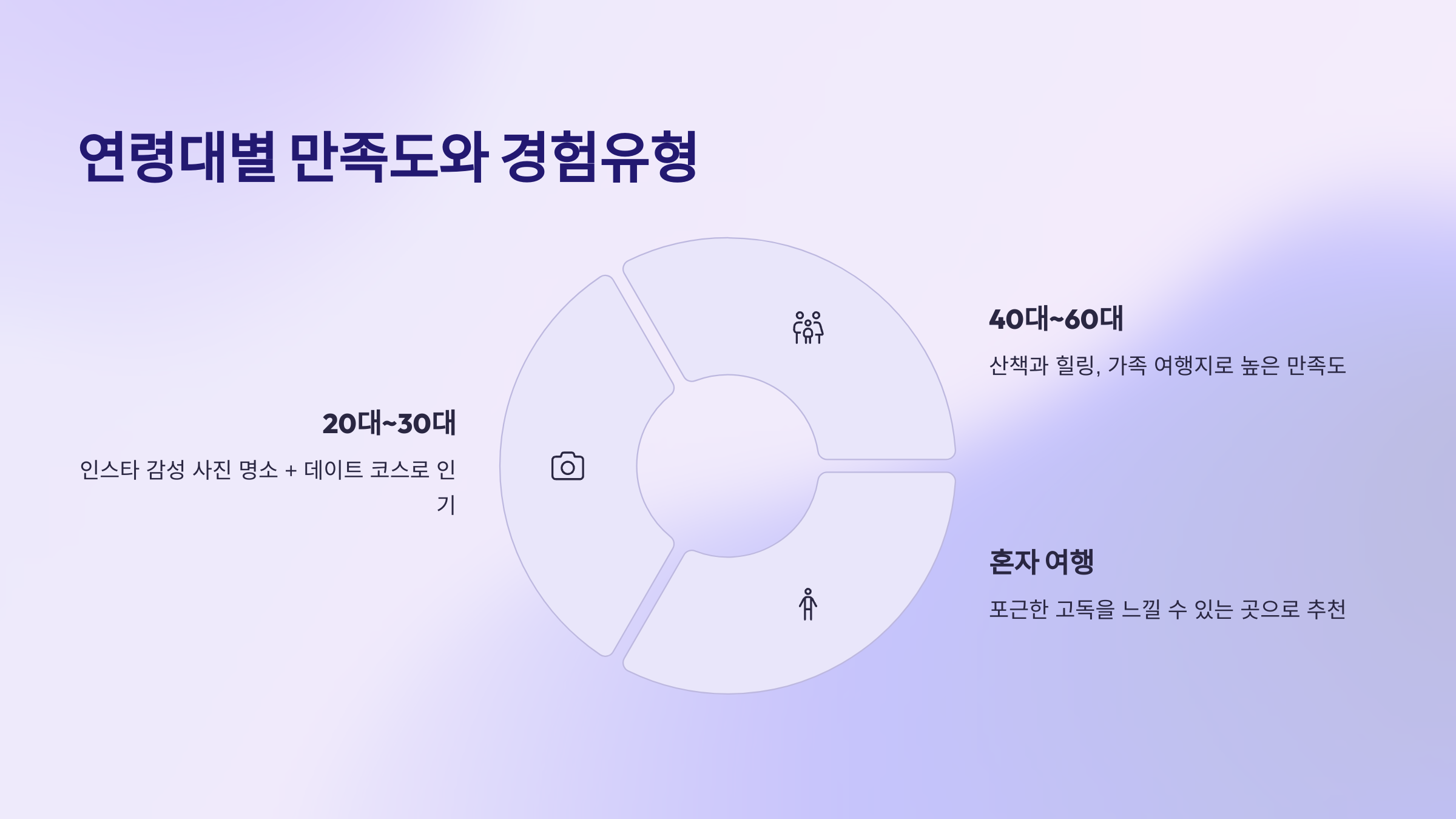 - 40대~60대: 산책과 힐링, 가족 여행지로 높은 만족도