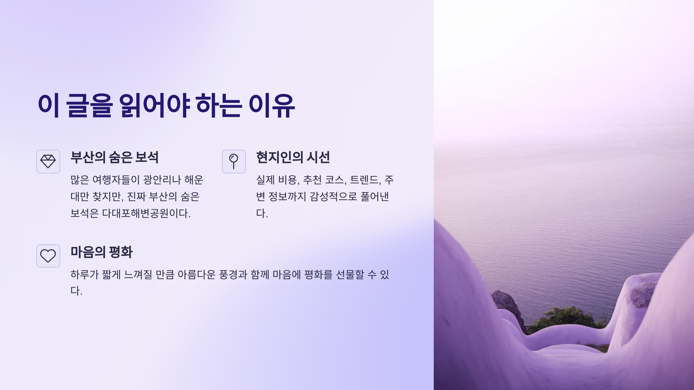 부산을 찾는 많은 여행자들이 광안리나 해운대를 떠올리지만, 진짜 부산의 숨은 보석은 다대포해변공원이라는 걸 아는 사람은 드물다. 이 글에서는 그 조용한 아름다움을 직접 경험한 여행자의 시선으로, 실제 비용, 추천 코스, 트렌드, 그리고 주변 정보까지 감성적으로 풀어낸다. 하루가 짧게 느껴질 만큼 아름다운 풍경과 함께, 복잡한 일상에서 벗어나 마음에 평화를 선물할 수 있다.
