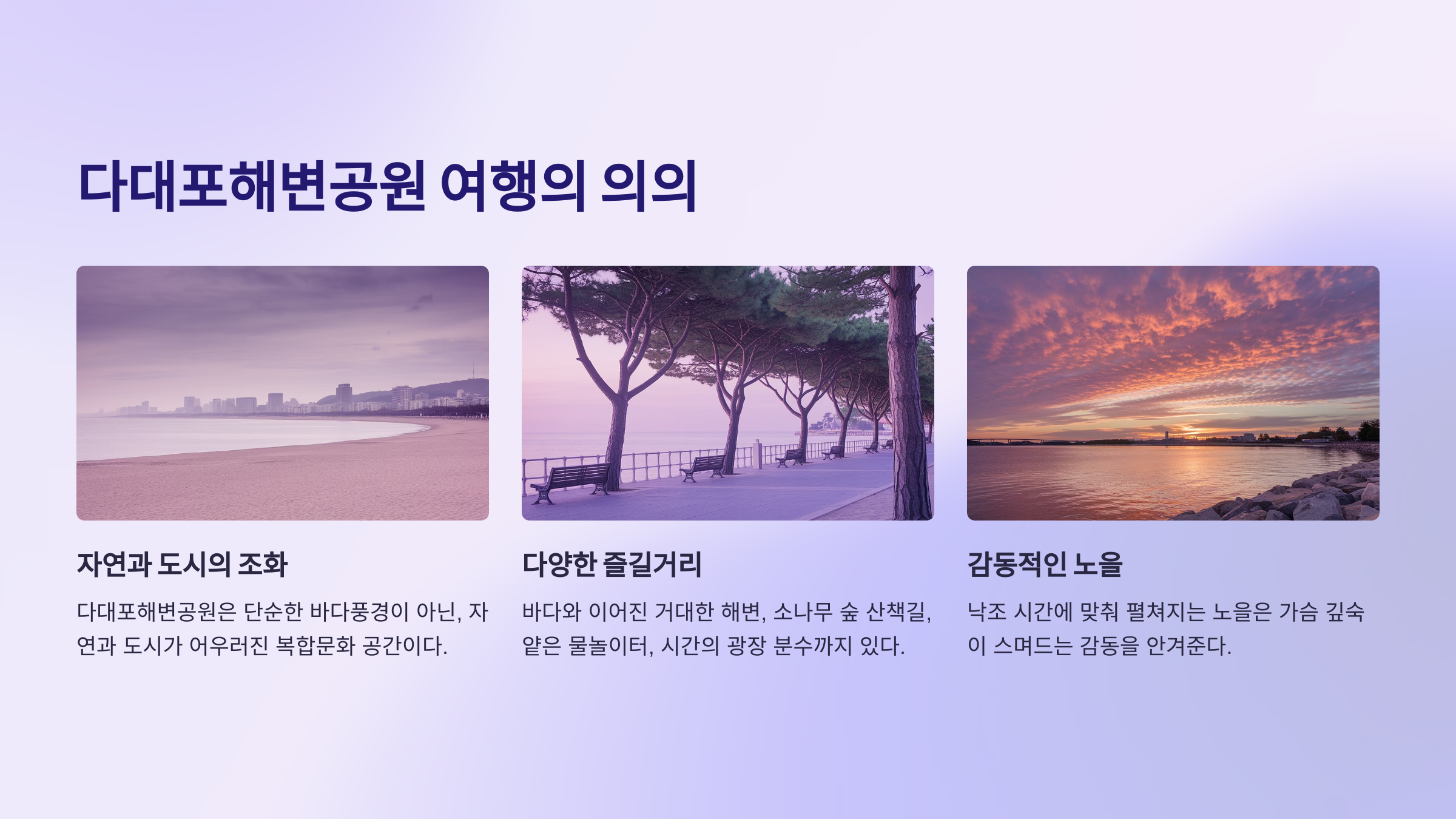 다대포해변공원 여행은 ‘특별한 것 없이도 충분히 특별한 순간’을 만드는 곳입니다. 누구와 함께해도, 혹은 혼자여도 마음 한 켠이 따뜻해지는 경험이 될 거예요. 일상에 지쳤을 때, 오늘보다 더 나은 내일을 위해 다대포해변공원에서 나를 위한 시간을 선물해 보세요.