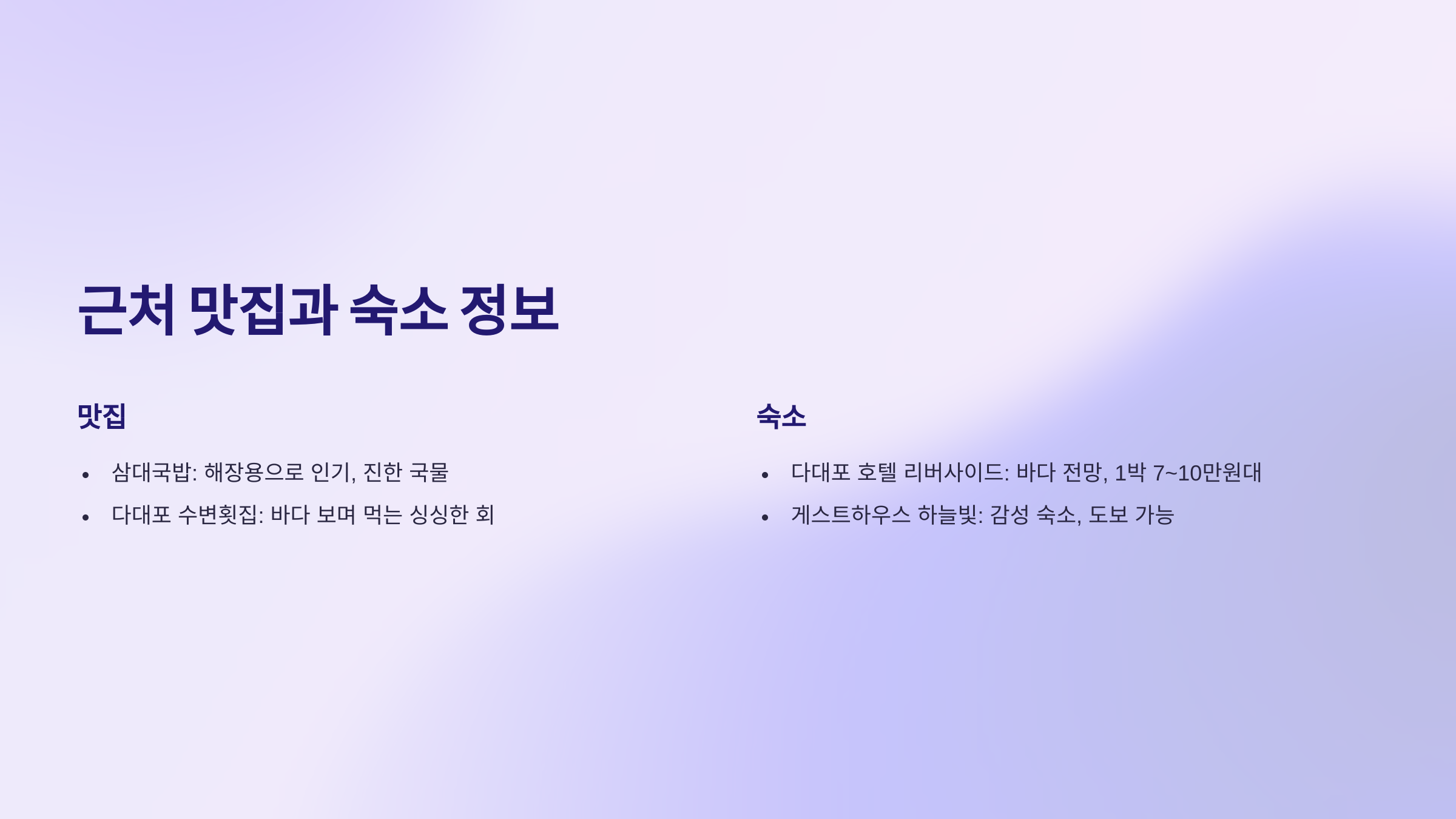 - 추천 여행시간: 일몰 1시간 전 도착하여 노을 감상 + 밤 산책