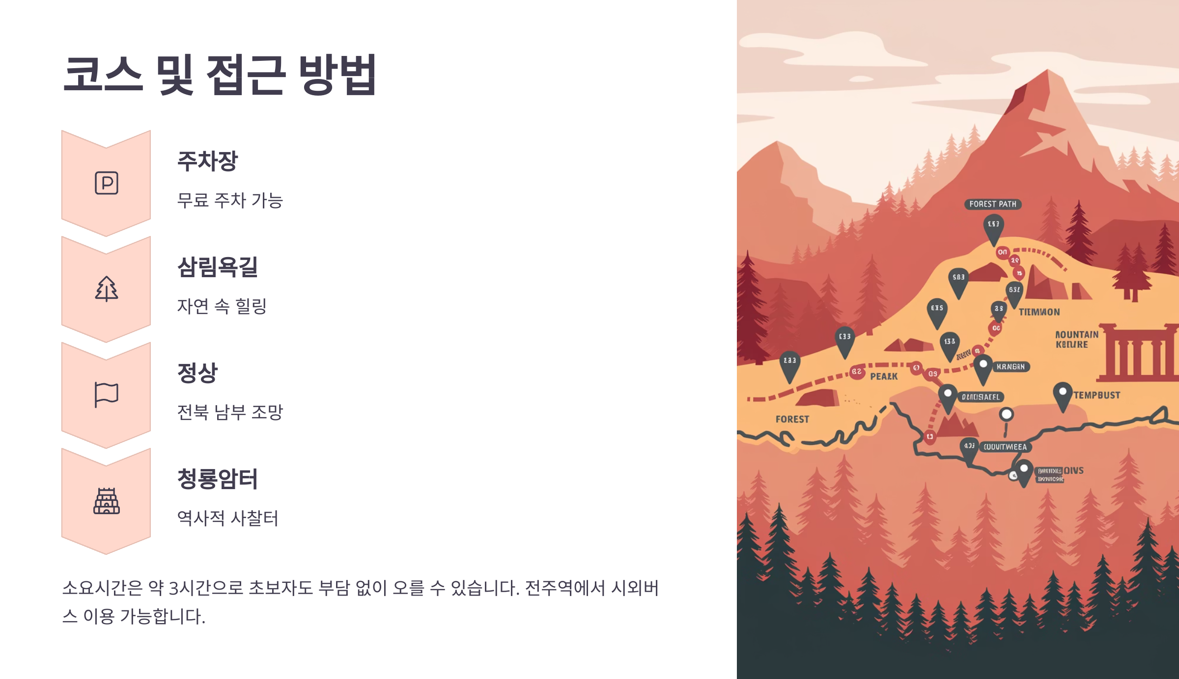대중교통은 전주역에서 시외버스를 이용해 감암산 입구까지 이동이 가능하며, 차를 이용하면 네비에 '감암산 등산로 입구'로 검색하시면 돼요.