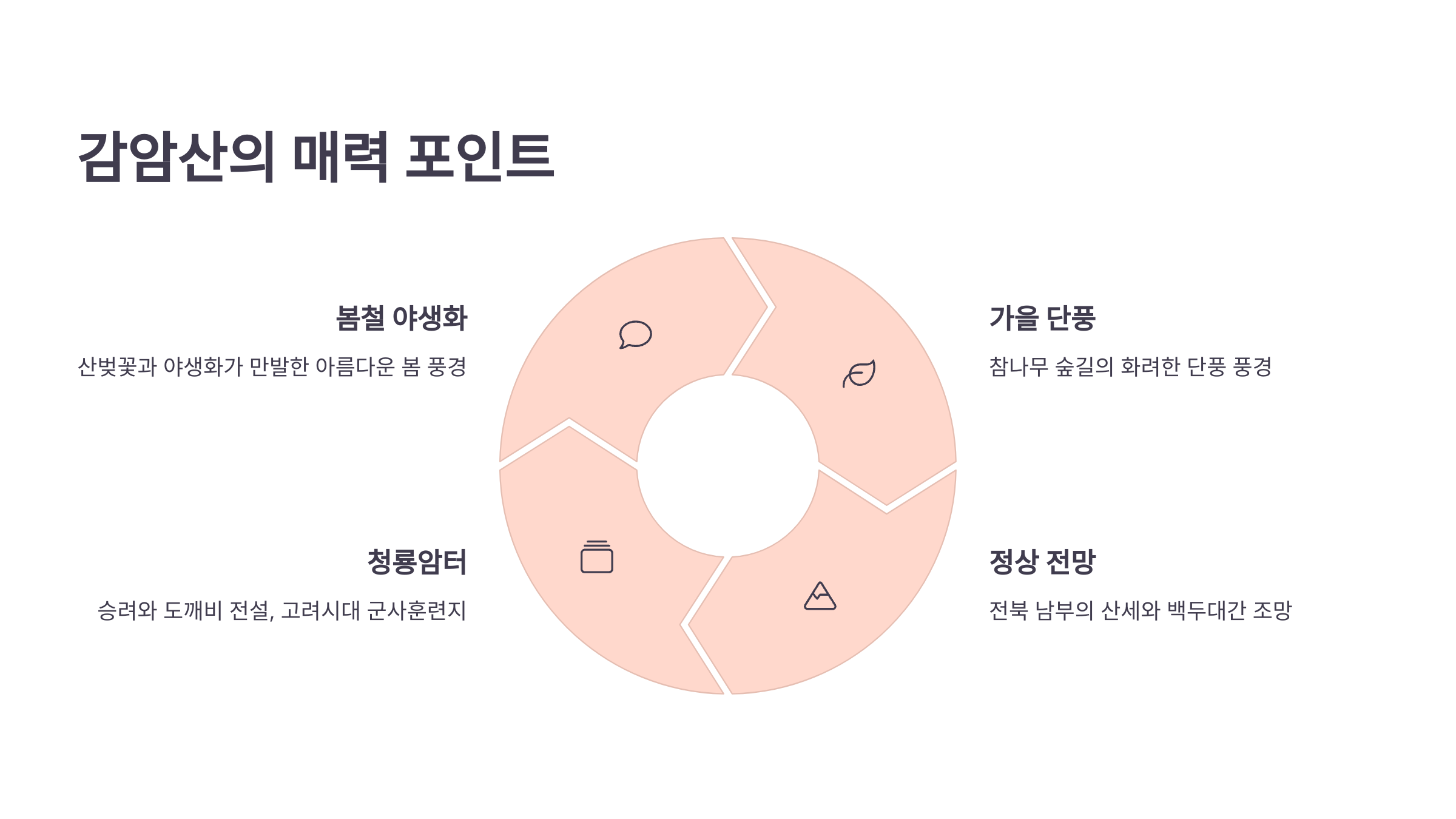 감암산은 사계절이 모두 아름답지만, 봄철 야생화와 가을 단풍이 특히 인상 깊어요. 등산로를 따라 펼쳐진 산벚꽃과 참나무 숲길은 그야말로 걷는 힐링이죠. 정상에서 바라본 전북 남부의 산세 풍경은 가히 예술이며, 날씨 맑은 날엔 멀리 백두대간 줄기도 보입니다.