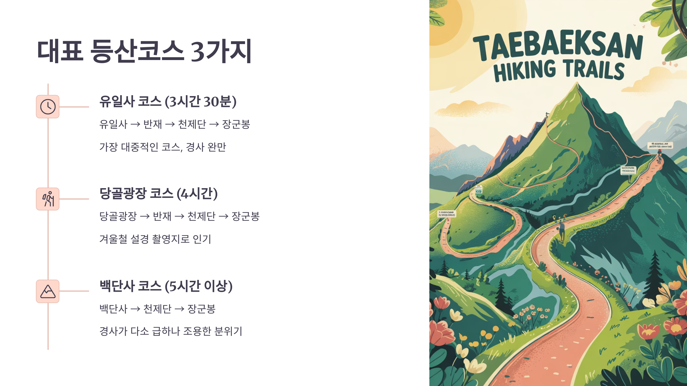 - 태백산 등산코스 3가지를 비교해 나에게 맞는 난이도를 고를 수 있어요.