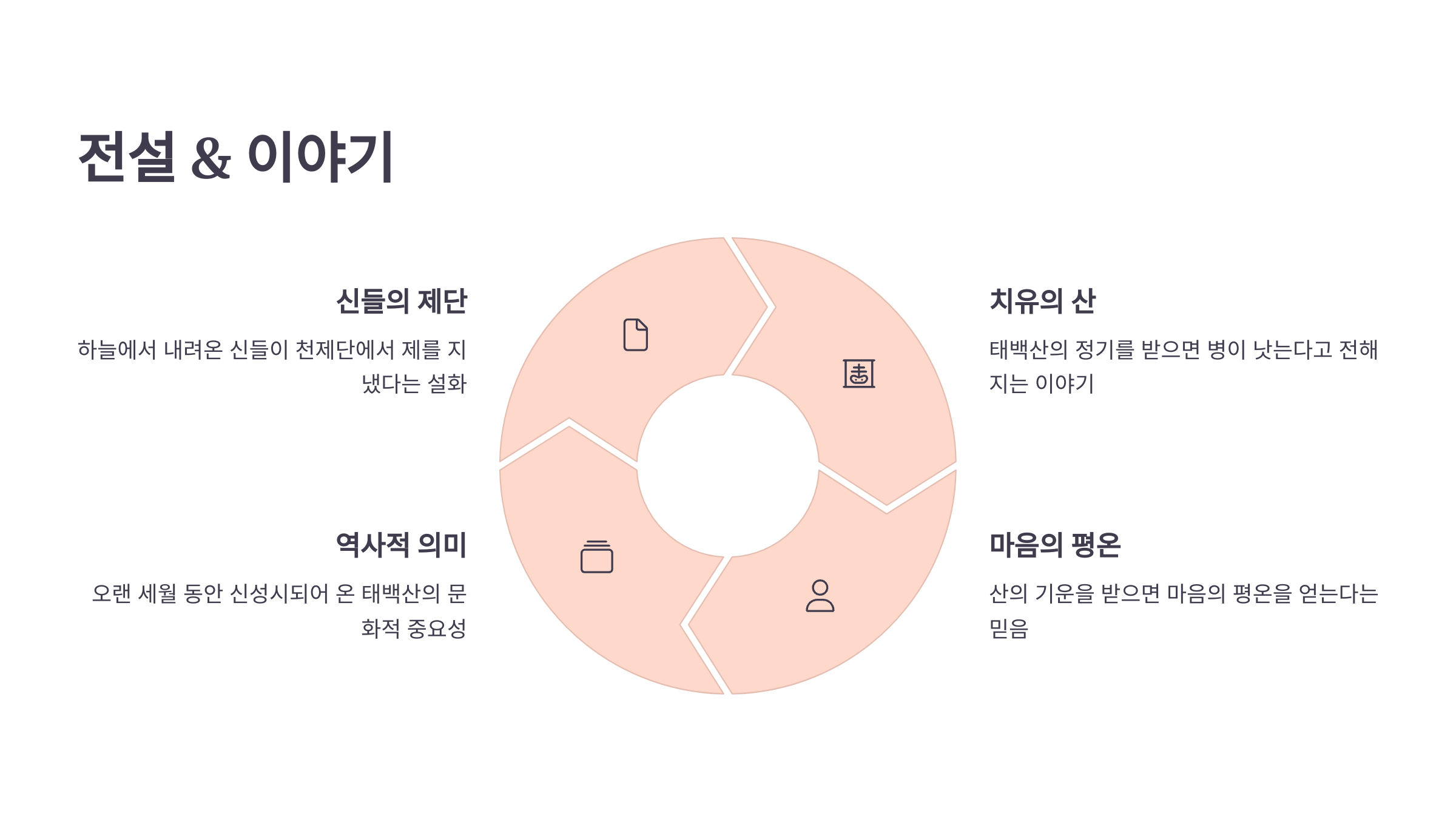 전해지는 이야기 중 하나는 하늘에서 내려온 신들이 천제단에서 제를 지냈다는 설화입니다. 태백산의 정기를 받으면 병이 낫고, 마음의 평온을 얻는다고도 해요.