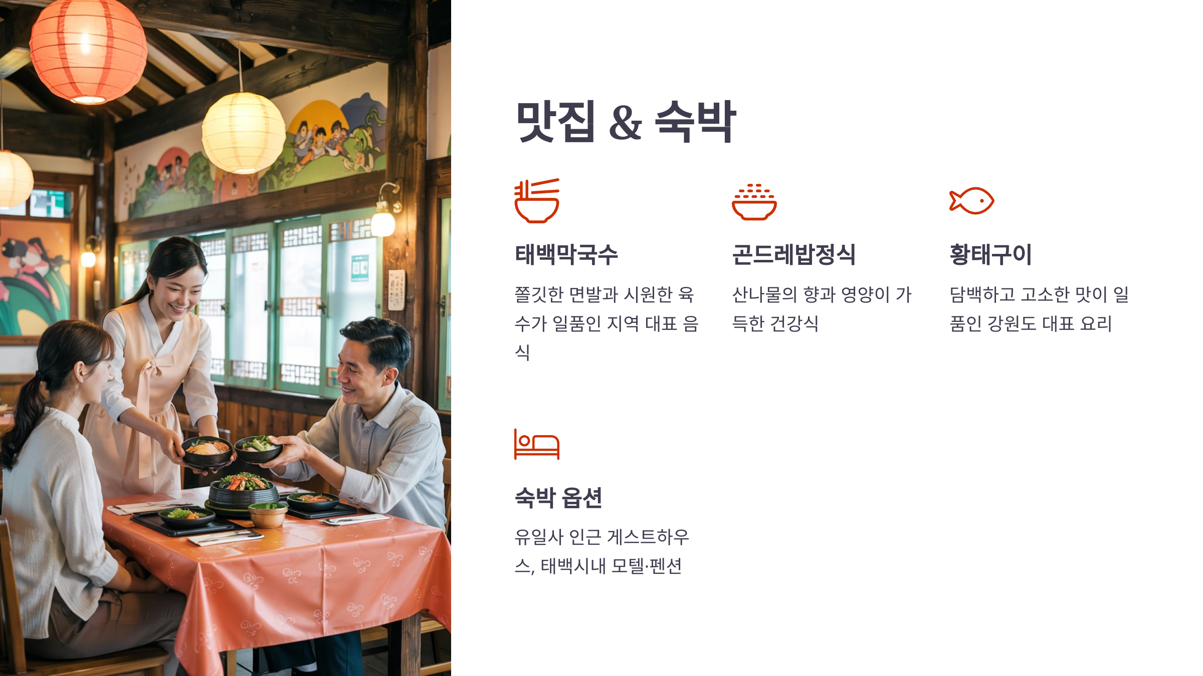 - 맛집 추천: 태백막국수, 곤드레밥정식, 황태구이