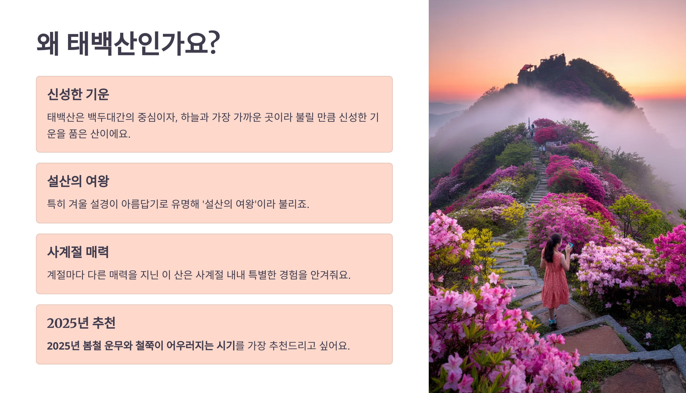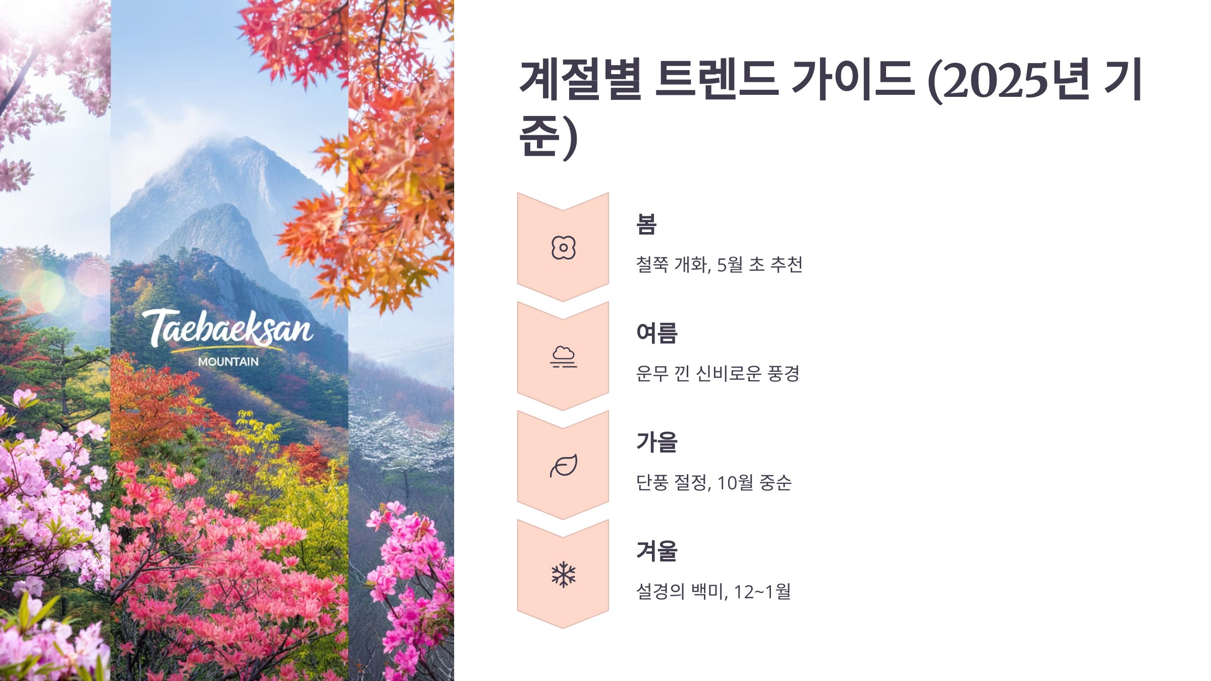 태백산은 백두대간의 중심이자, 하늘과 가장 가까운 곳이라 불릴 만큼 신성한 기운을 품은 산이에요. 특히 겨울 설경이 아름답기로 유명해 '설산의 여왕'이라 불리죠. 하지만 계절마다 다른 매력을 지닌 이 산은 사계절 내내 특별한 경험을 안겨줘요. 저는 특히 2025년 봄철 운무와 철쭉이 어우러지는 시기를 가장 추천드리고 싶어요.