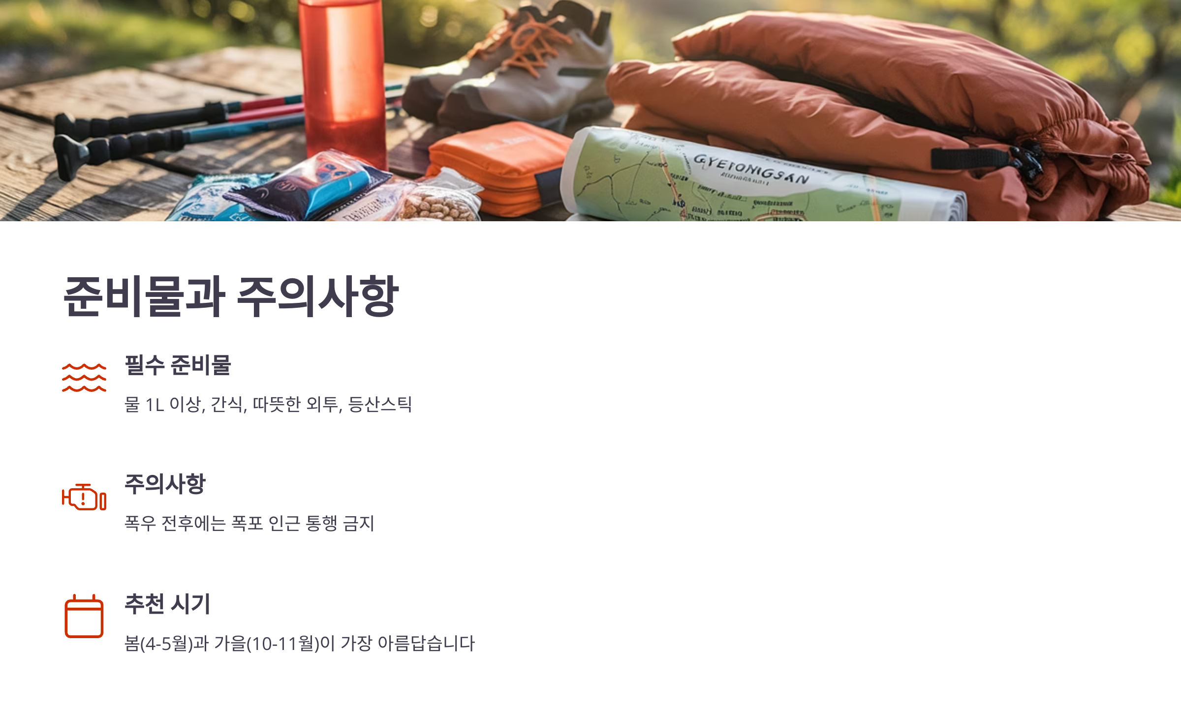 - 준비물: 물 1L 이상, 간식, 따뜻한 외투, 등산스틱