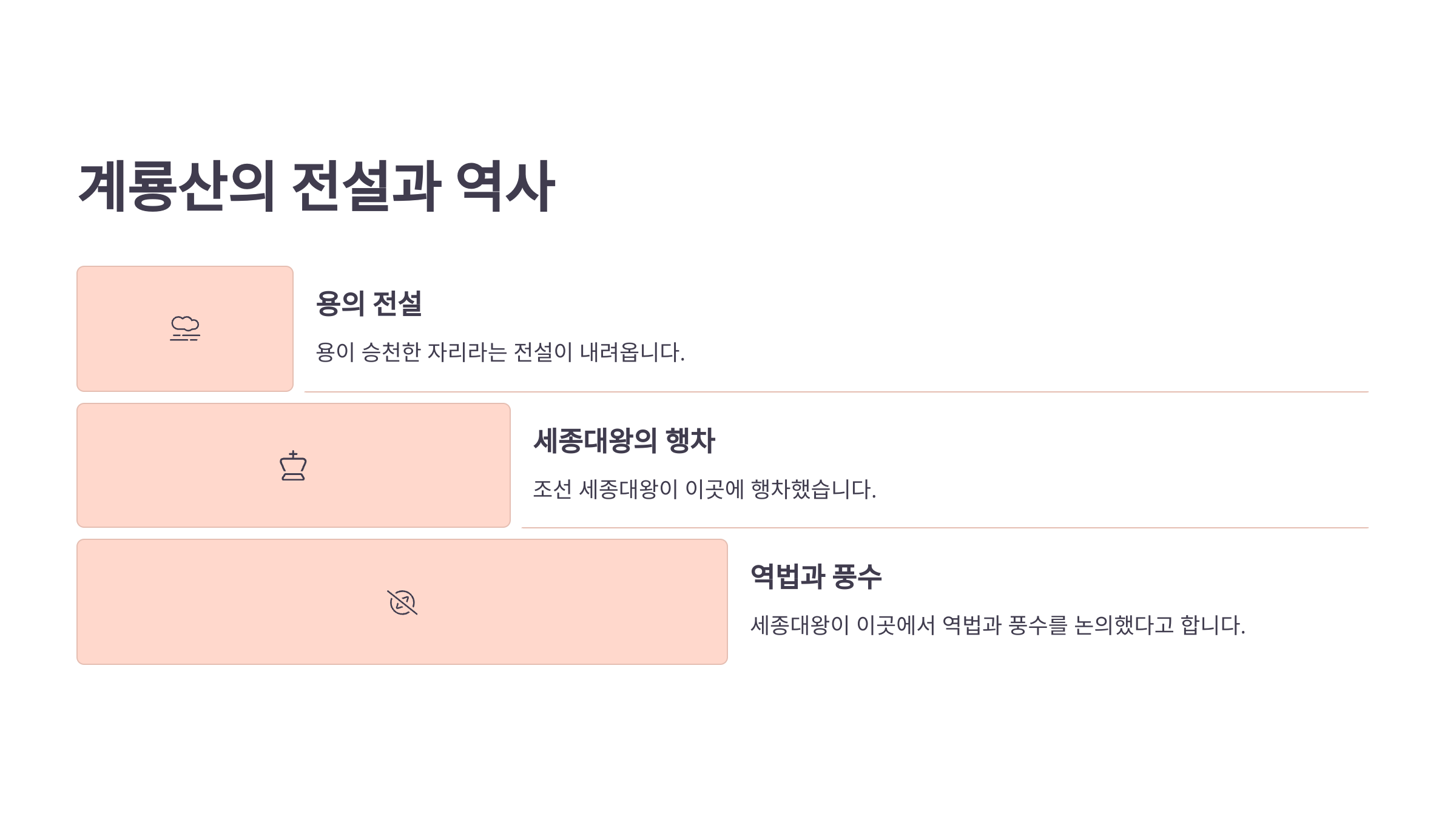 계룡산에는 ‘용이 승천한 자리’라는 전설 외에도, 조선 세종대왕이 이곳에 행차하여 역법과 풍수를 논의했다는 이야기도 전해집니다.