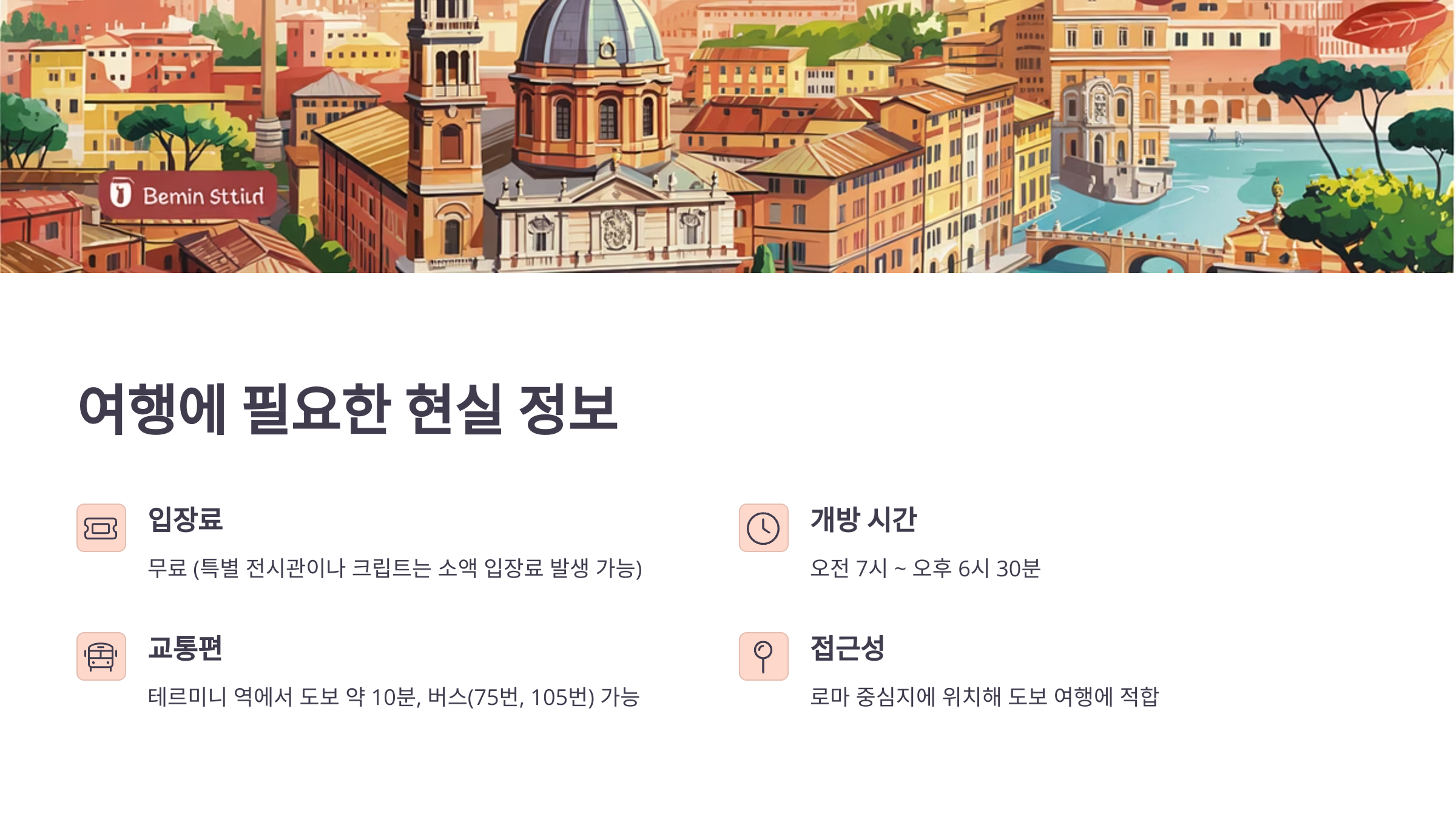 - 교통편: 테르미니 역에서 도보 약 10분, 버스(75번, 105번) 가능