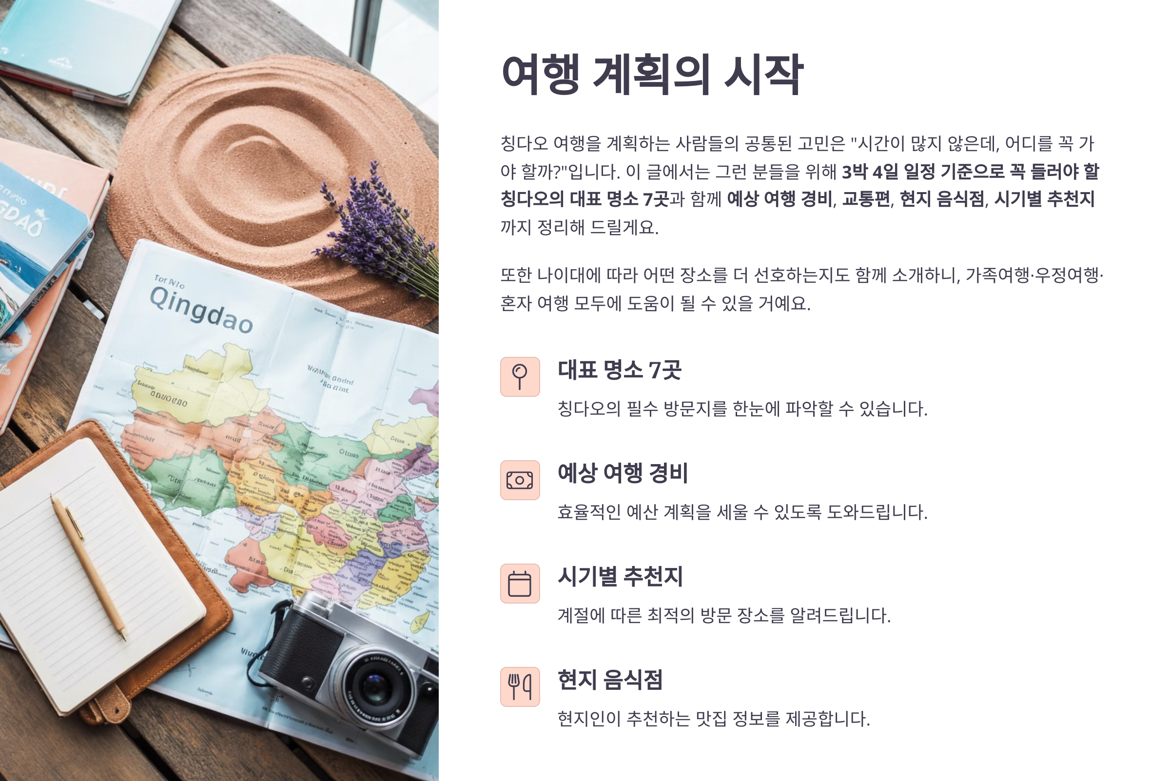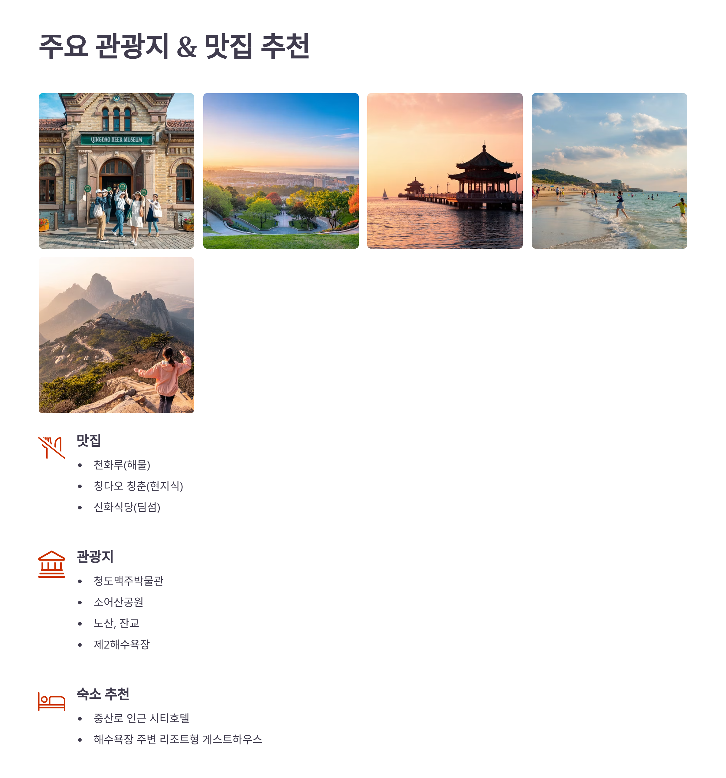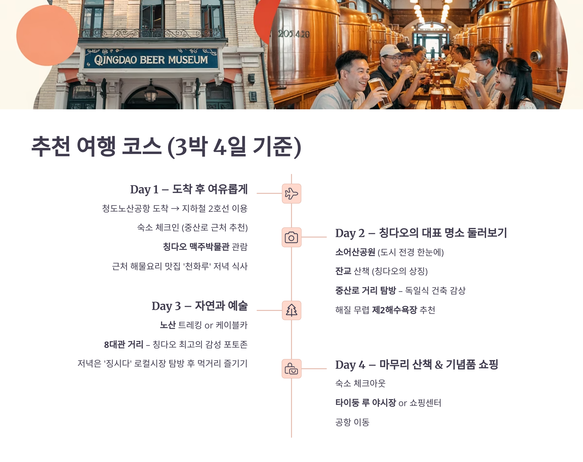 이 글에서는 그런 분들을 위해 3박 4일 일정 기준으로 꼭 들러야 할 칭다오의 대표 명소 7곳과 함께 예상 여행 경비, 교통편, 현지 음식점, 시기별 추천지까지 정리해 드릴게요.