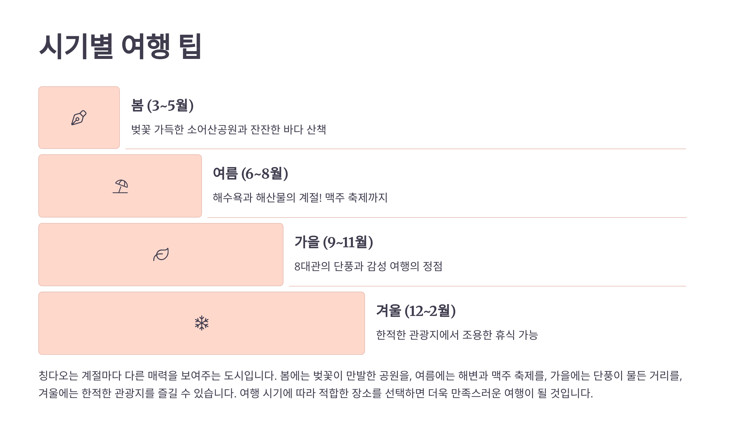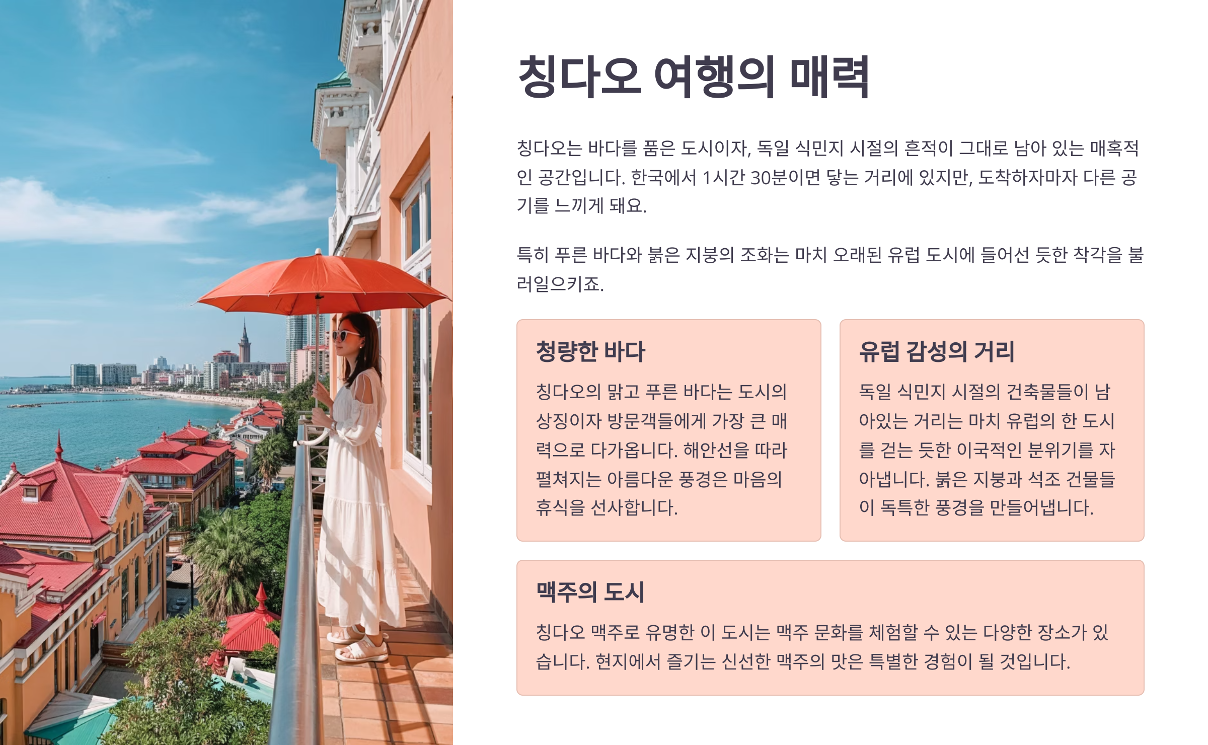 길게 이어지는 해안선을 따라 걷다 보면, 마음속 작은 상처들도 어느새 파도에 씻겨나가는 듯합니다. 찬란했던 한때의 기억처럼, 칭다오(청도)는 그렇게 조용히 우리 곁에 다가옵니다. 이번 글은 '처음 칭다오를 여행하는 분들'을 위한 안내서이자, 마음이 조금은 고단한 분들에게 건네는 감성적인 초대장이 될 거예요.