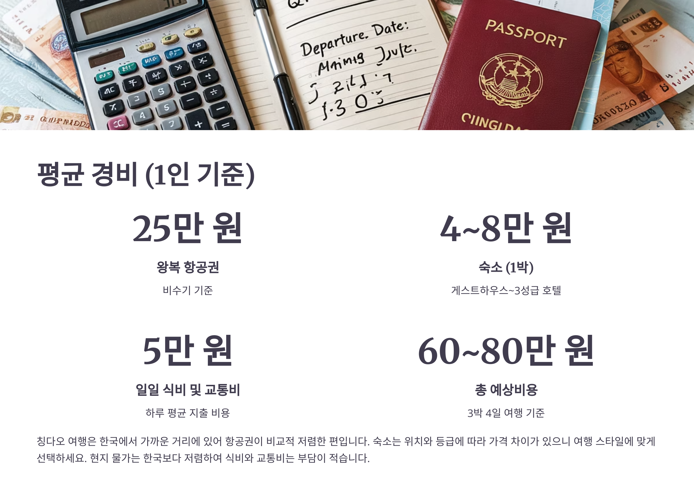 - 왕복 항공권: 약 25만 원 (비수기 기준)