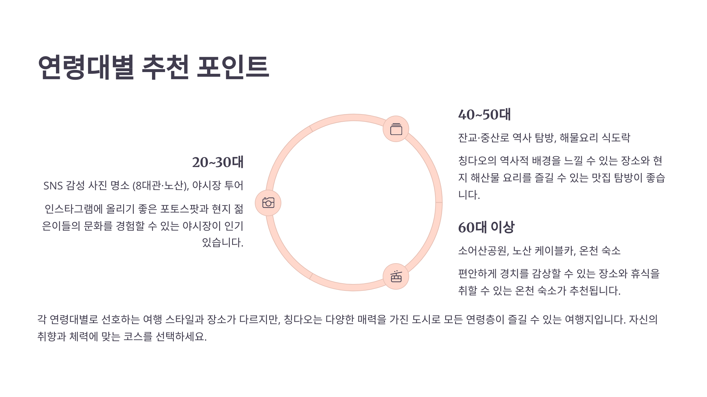 - 20~30대: SNS 감성 사진 명소 (8대관·노산), 야시장 투어