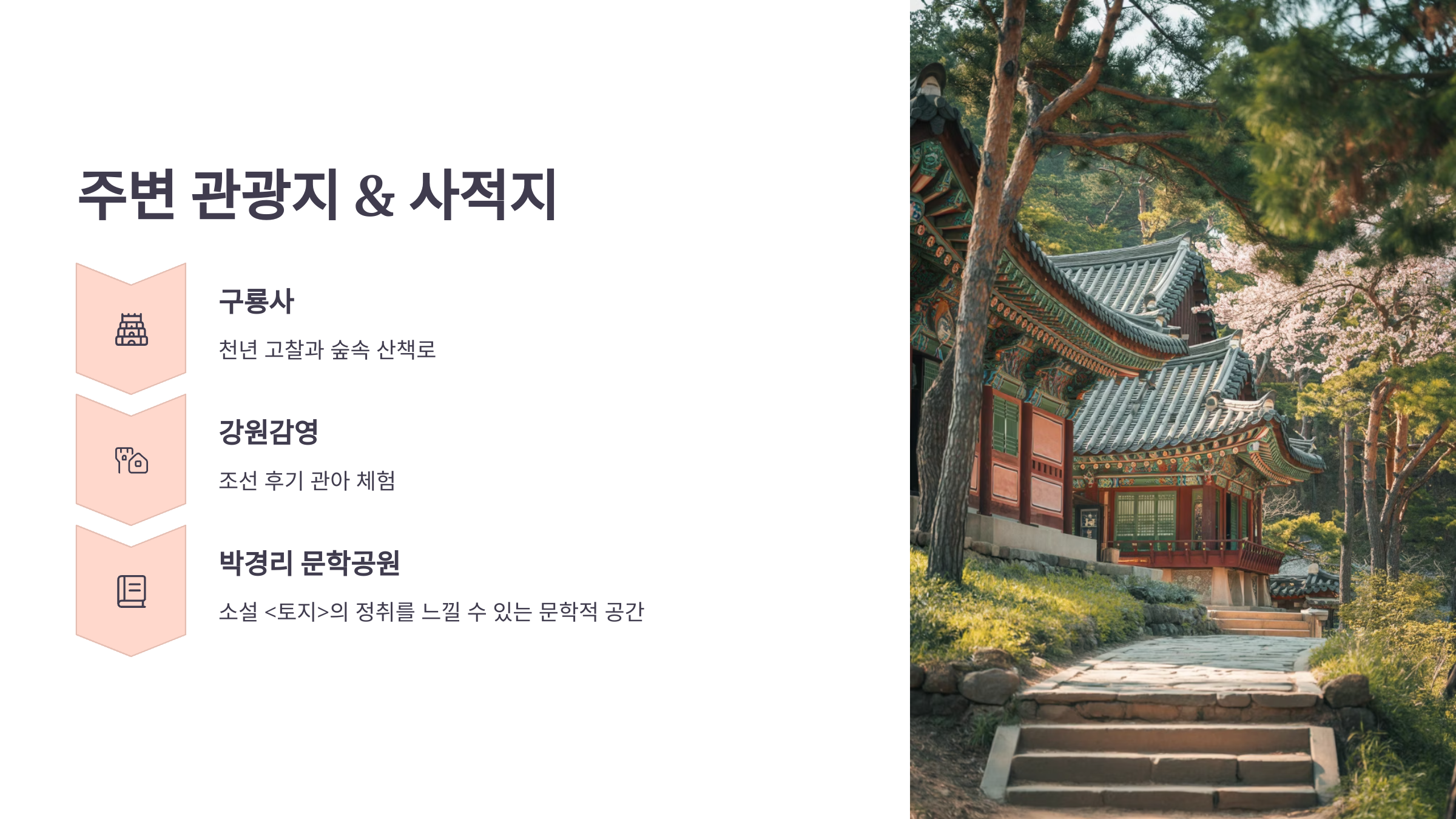 - 숙박: 원주 센트럴호텔, 뮤지엄산 리조트(인근 고급 숙소), 에어비앤비 다수