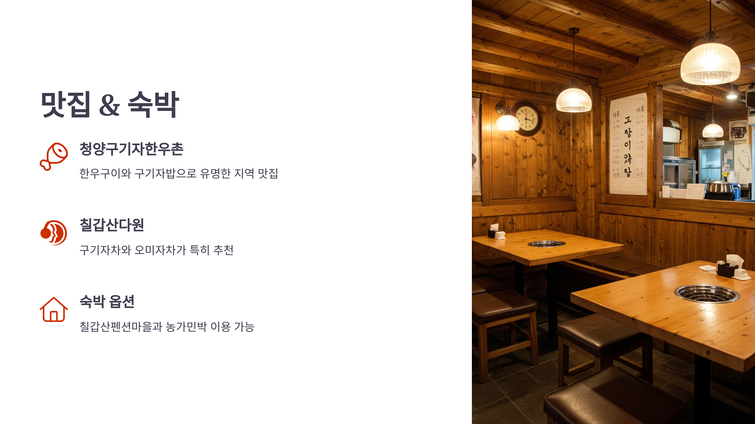 - 맛집: 청양구기자한우촌 (한우구이, 구기자밥 유명)