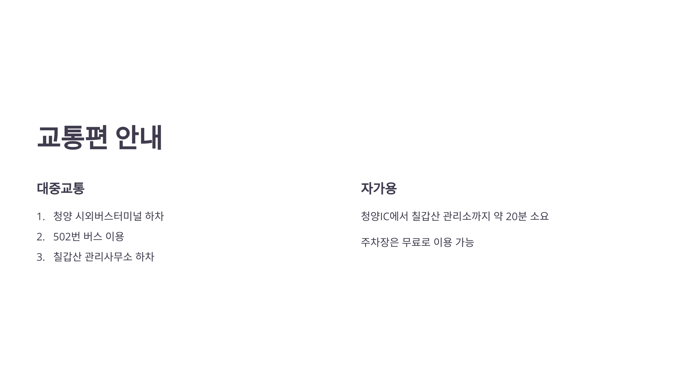 - 자가용: 청양IC → 칠갑산 관리소까지 약 20분 소요