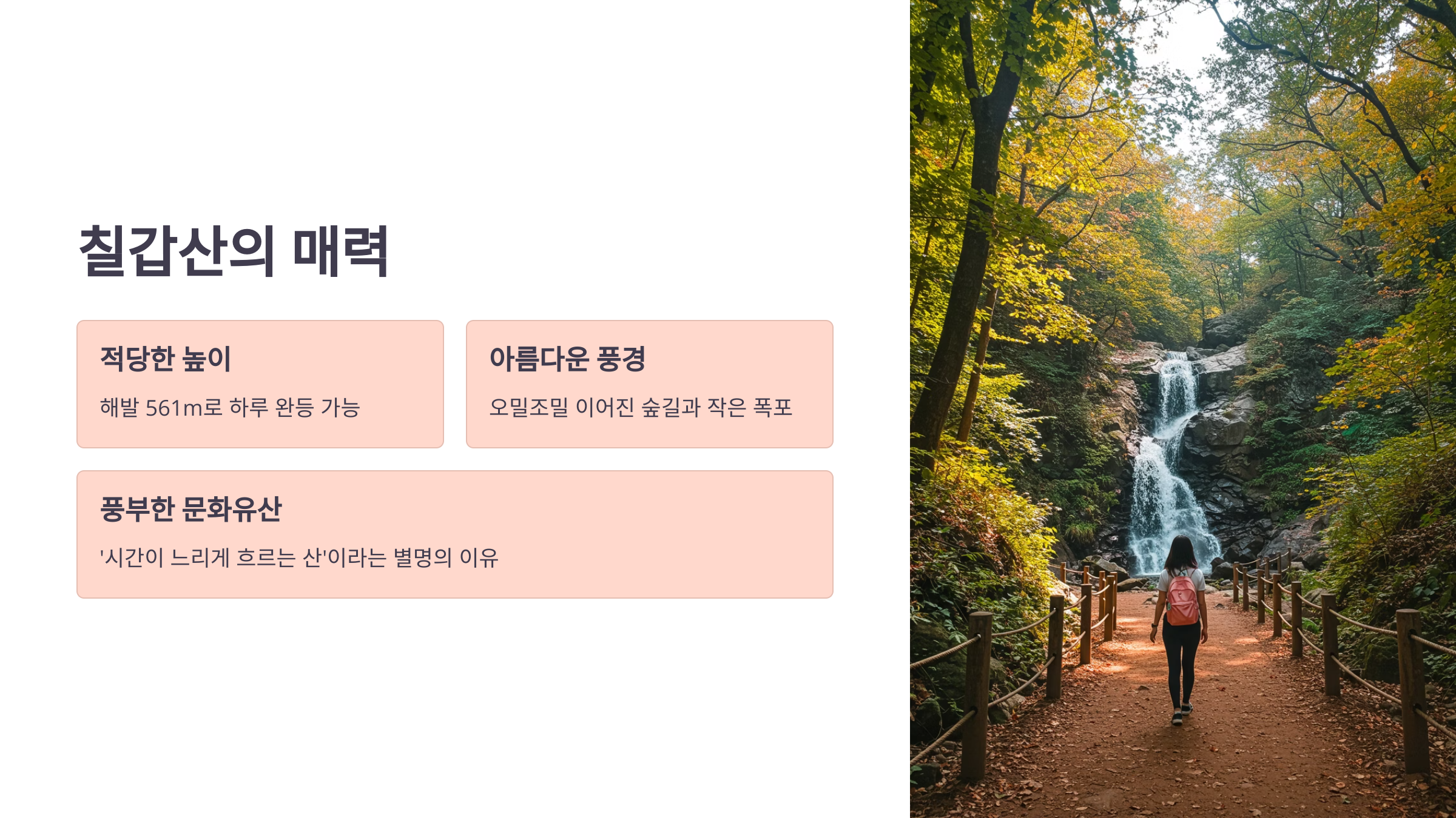 칠갑산은 '칠갑산 타령'으로도 익숙하지만, 실제로 걸어보면 그 아름다움에 놀라게 됩니다. 해발 561m로 높지는 않지만, 오밀조밀 이어진 숲길과 작은 폭포, 그리고 곳곳에 숨은 문화유산 덕분에 '시간이 느리게 흐르는 산'이라는 별명이 붙었지요.