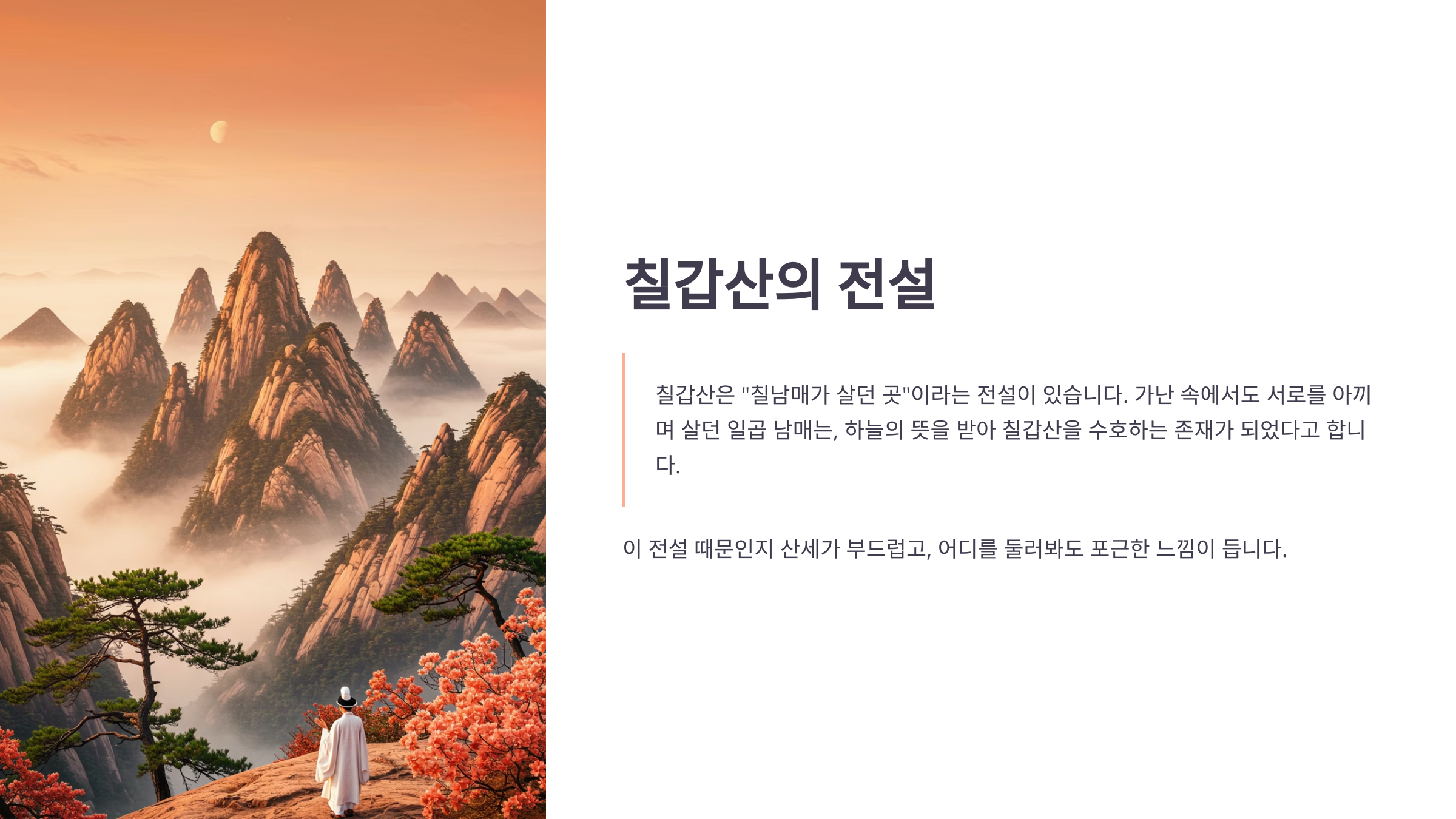 옛이야기에 따르면 칠갑산은 "칠남매가 살던 곳"이라는 전설이 있습니다. 가난 속에서도 서로를 아끼며 살던 일곱 남매는, 하늘의 뜻을 받아 칠갑산을 수호하는 존재가 되었다고 하네요. 그래서인지 산세가 부드럽고, 어디를 둘러봐도 포근한 느낌이 듭니다.