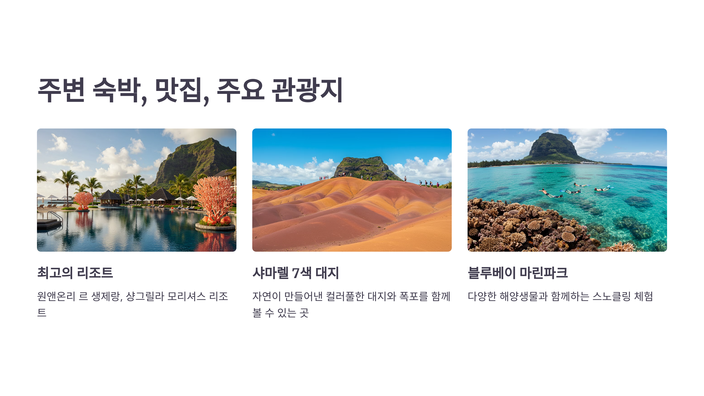 - 가족여행: 모리셔스 가든, 바다거북 체험 등 안전하고 다양한 프로그램이 인기