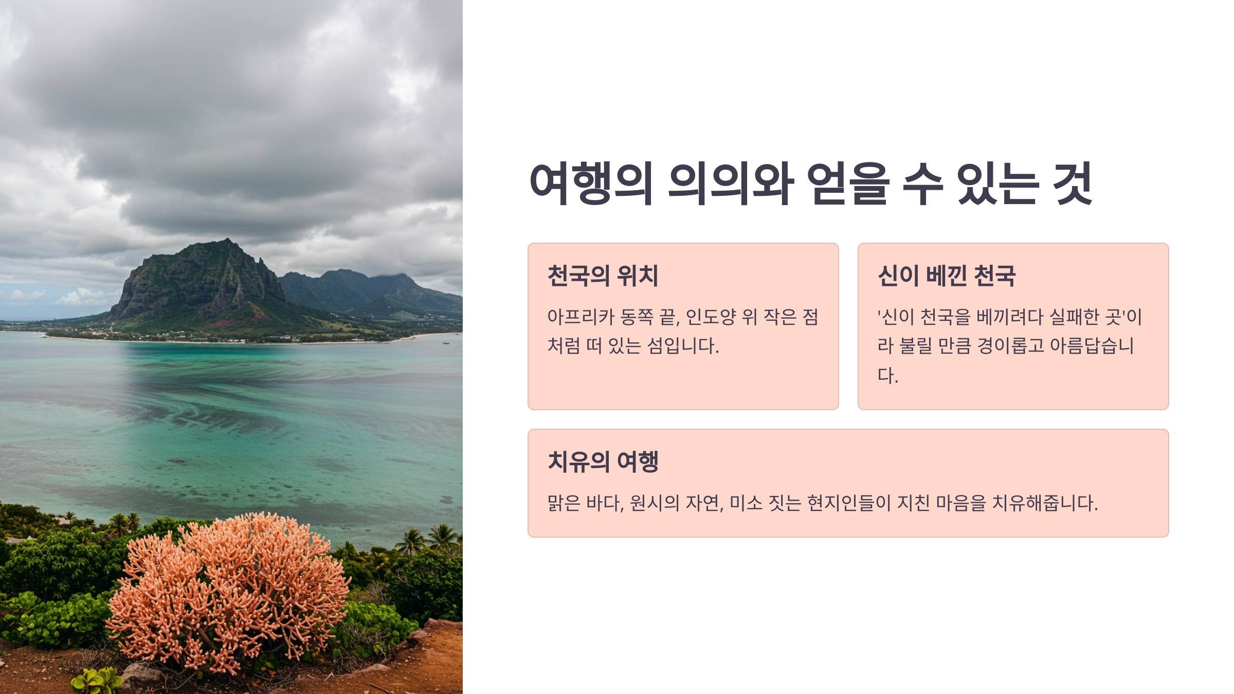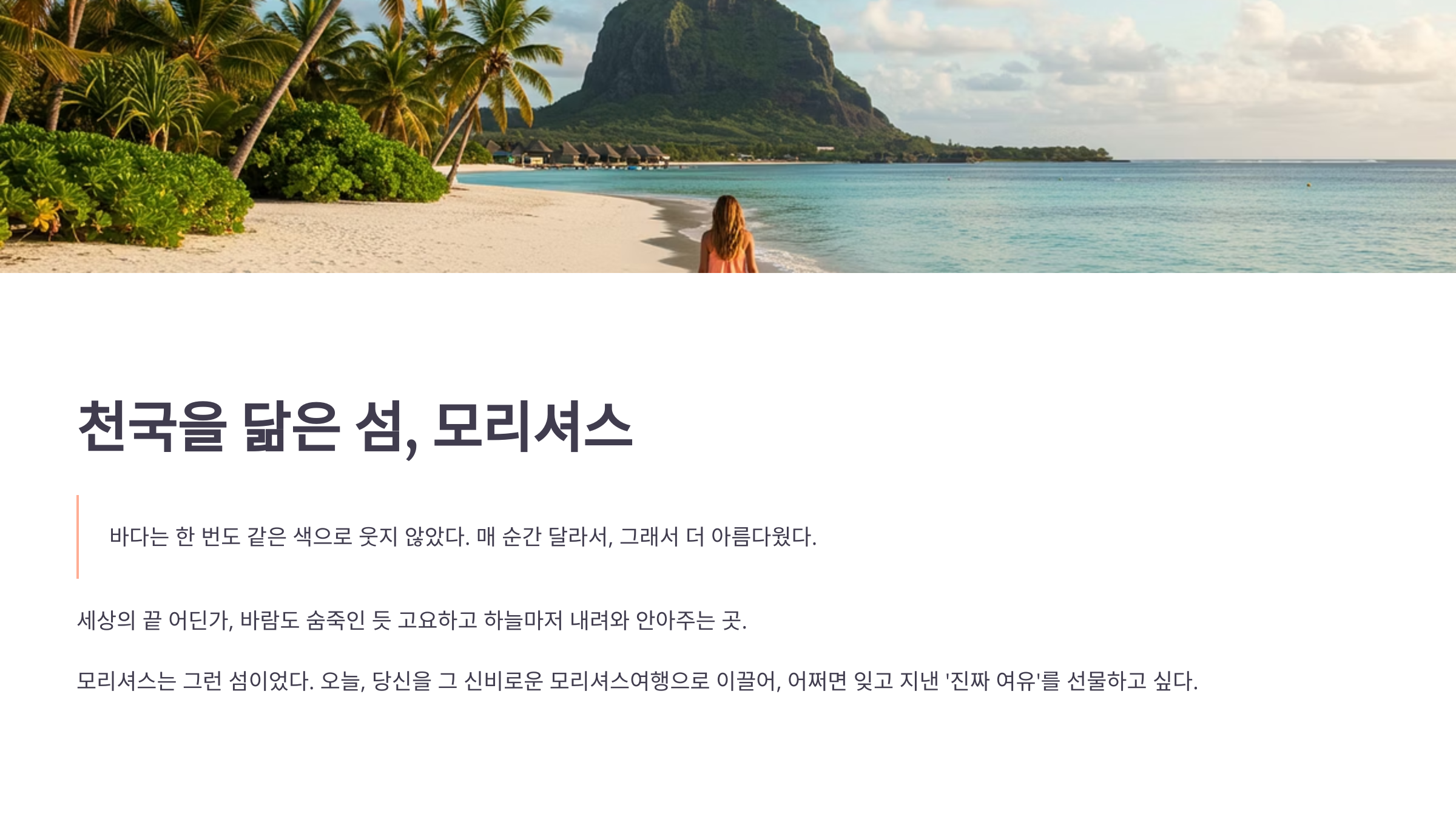 모리셔스는 그런 섬이었다. 오늘, 당신을 그 신비로운 모리셔스여행으로 이끌어, 어쩌면 잊고 지낸 '진짜 여유'를 선물하고 싶다.
