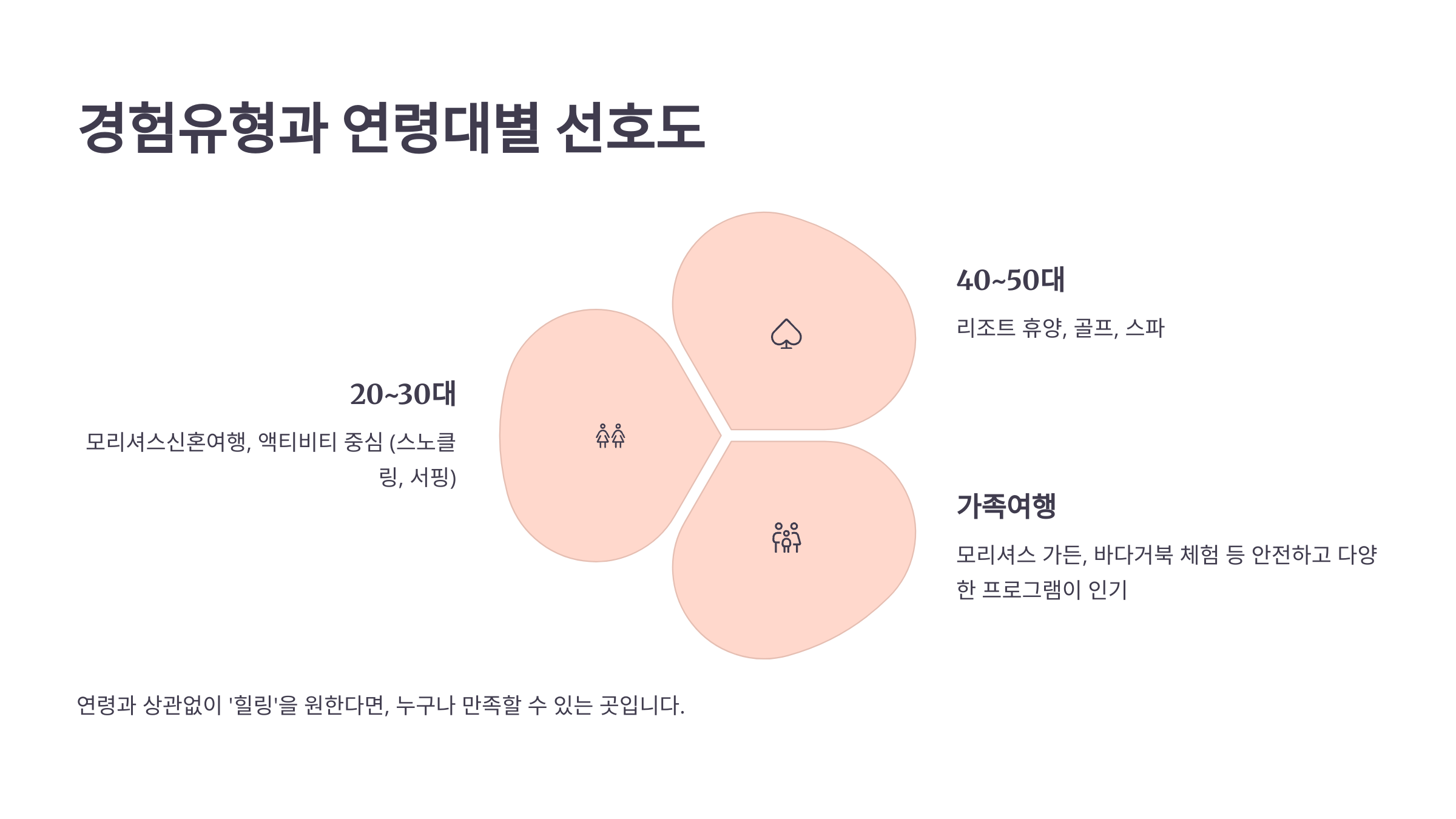 - 20~30대: 모리셔스신혼여행, 액티비티 중심 (스노클링, 서핑)