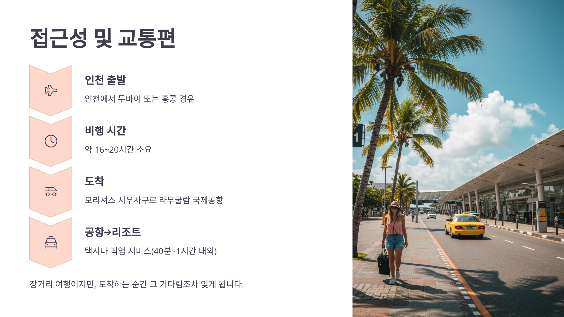 - 인천 → 두바이 또는 홍콩 → 모리셔스 시우사구르 라무굴람 국제공항(약 16~20시간 소요)