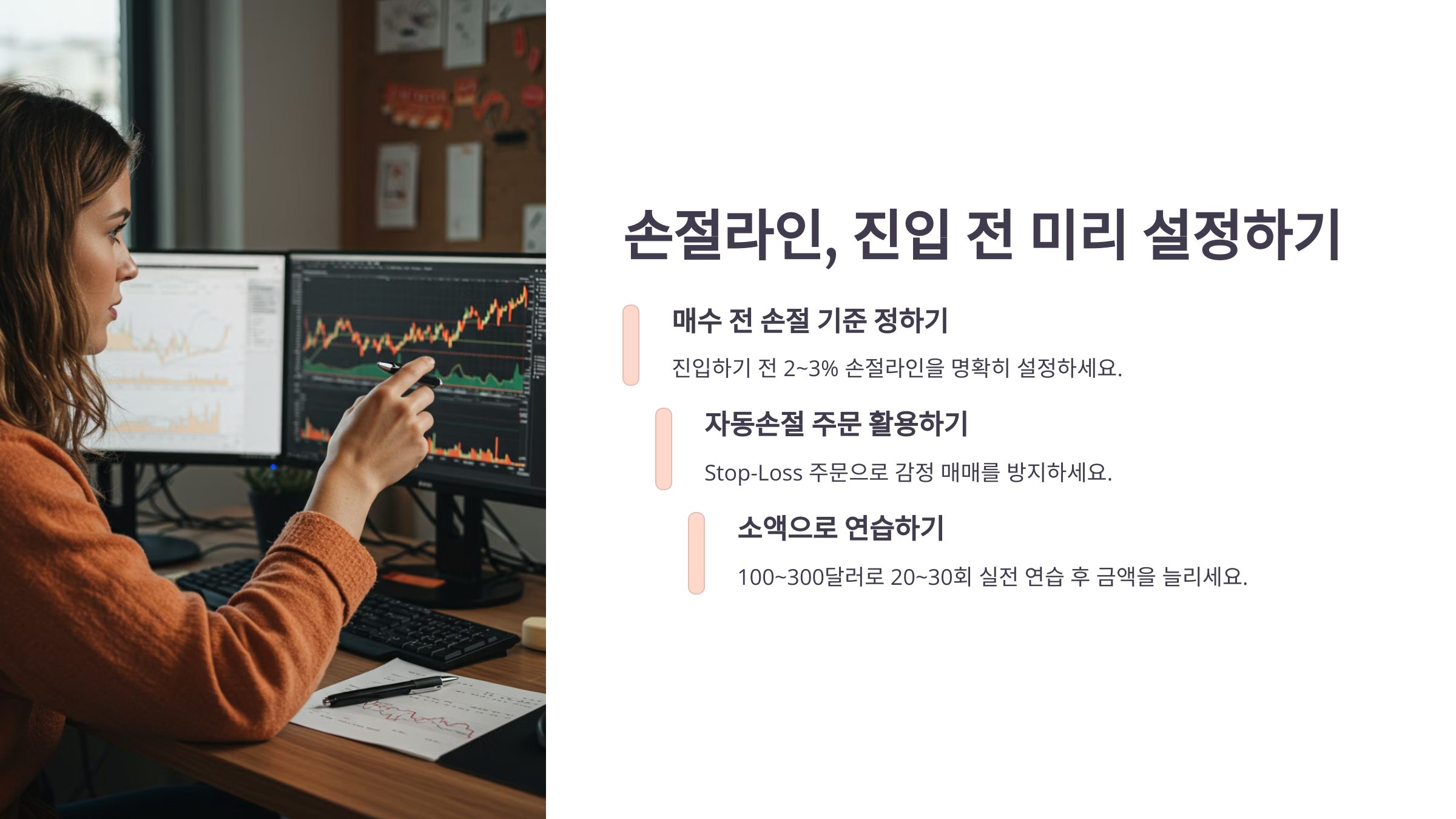 소액(예: 100~300달러)으로 20~30회 실전 연습 후