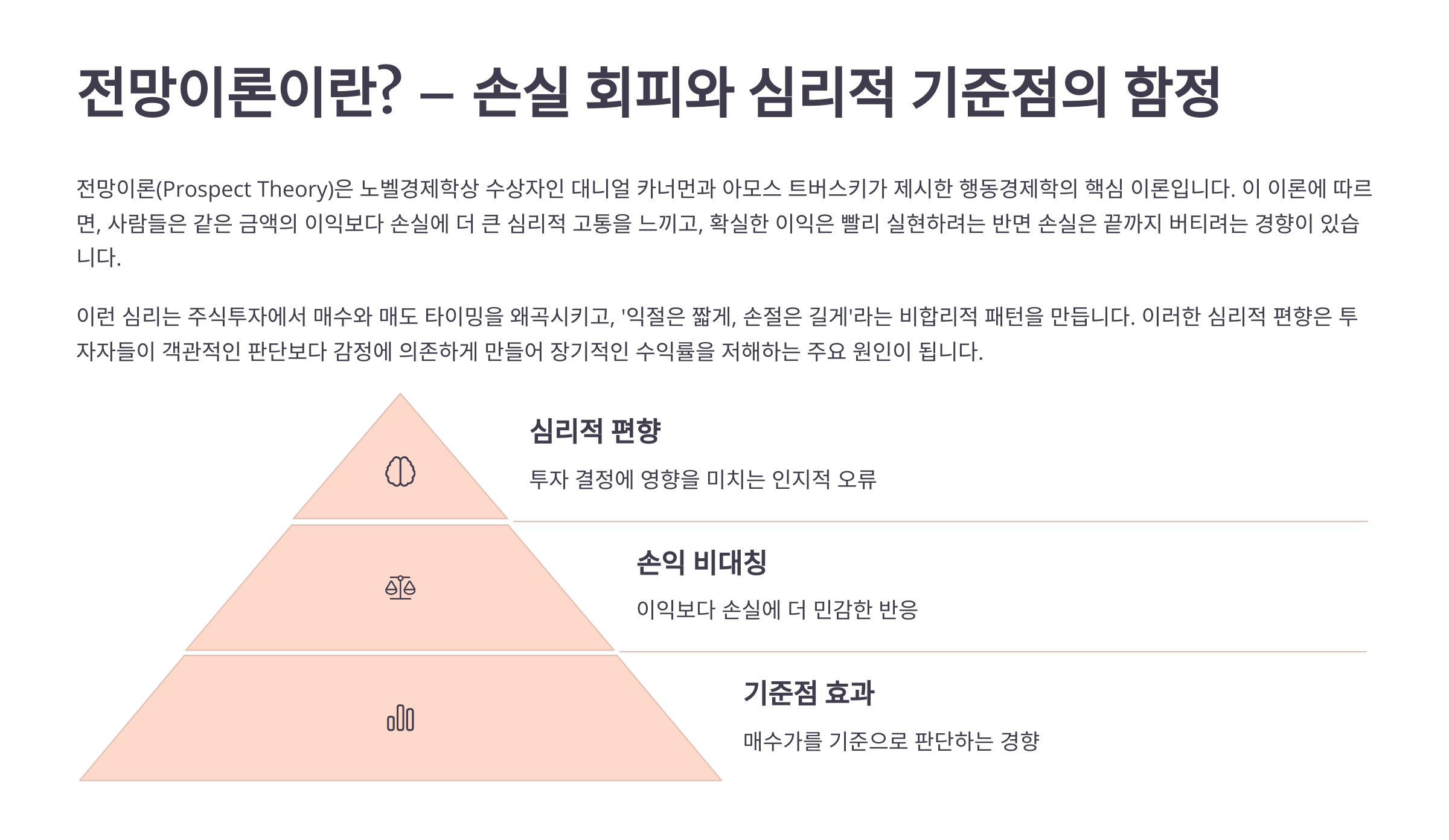 이 이론에 따르면, 사람들은 같은 금액의 이익보다 손실에 더 큰 심리적 고통을 느끼고, 확실한 이익은 빨리 실현하려는 반면 손실은 끝까지 버티려는 경향이 있습니다.