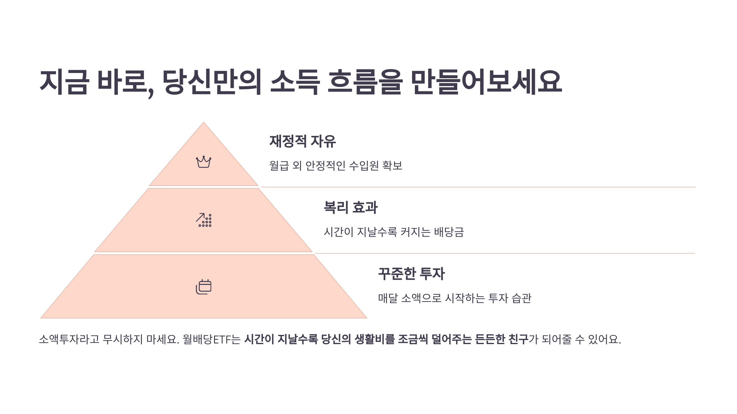 사실 2030세대에게 중요한 건 ‘큰돈’이 아닌 ‘지속 가능한 수입 구조를 만드는 법’입니다. 특히 매달 소액으로 시작할 수 있고, 시간과 함께 안정적인 현금흐름을 만들어주는 ‘월배당ETF’는 지금 가장 주목받는 투자 수단이에요.