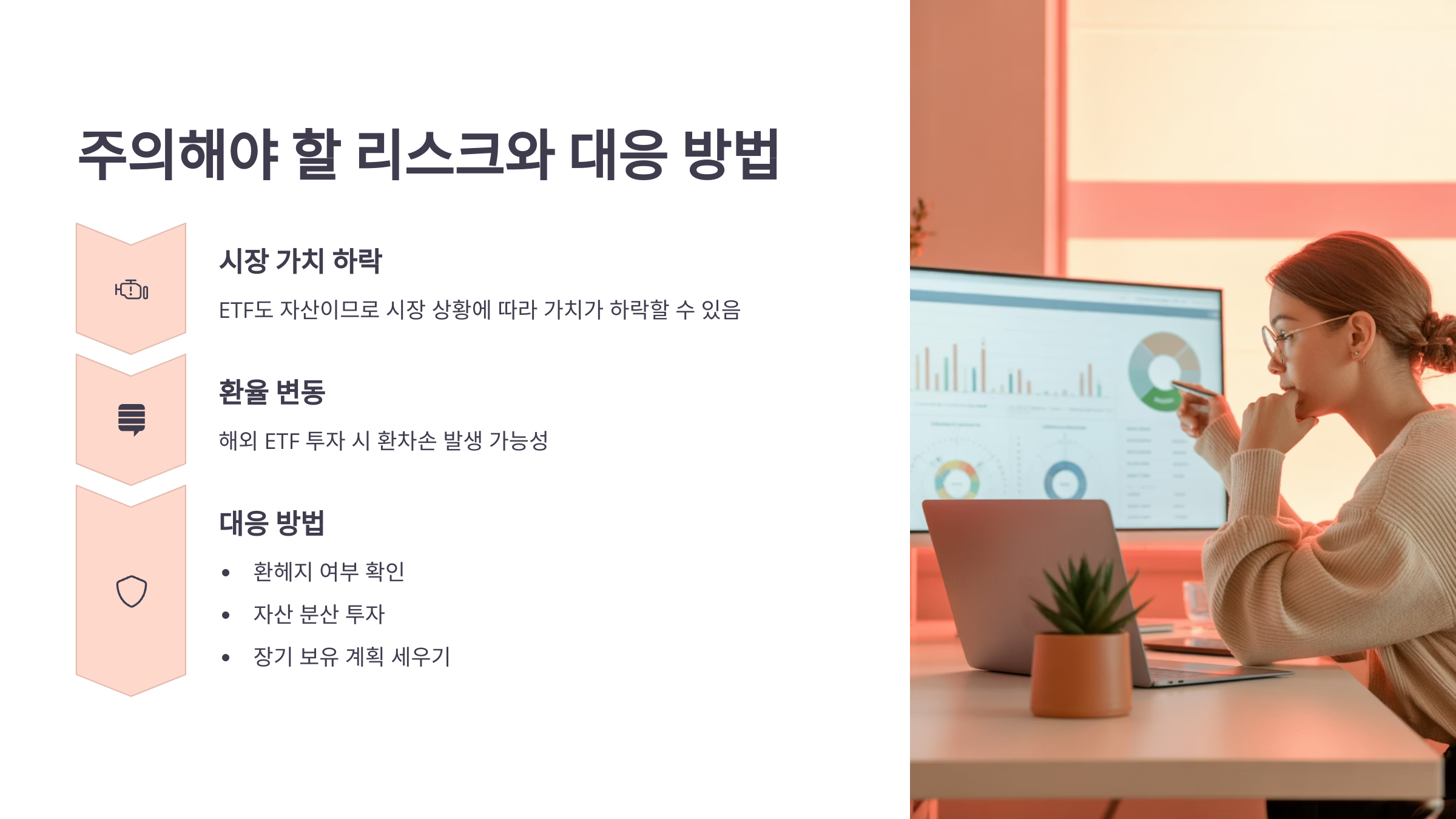 하지만 ‘배당’만 보고 무턱대고 투자하면 안 되죠. ETF도 자산이기 때문에 시장 상황에 따라 가치가 하락할 수 있고, 환율 변동에 따른 환차손이 발생할 수도 있어요. 이를 방지하기 위해서는 다음과 같은 원칙을 지켜야 해요: