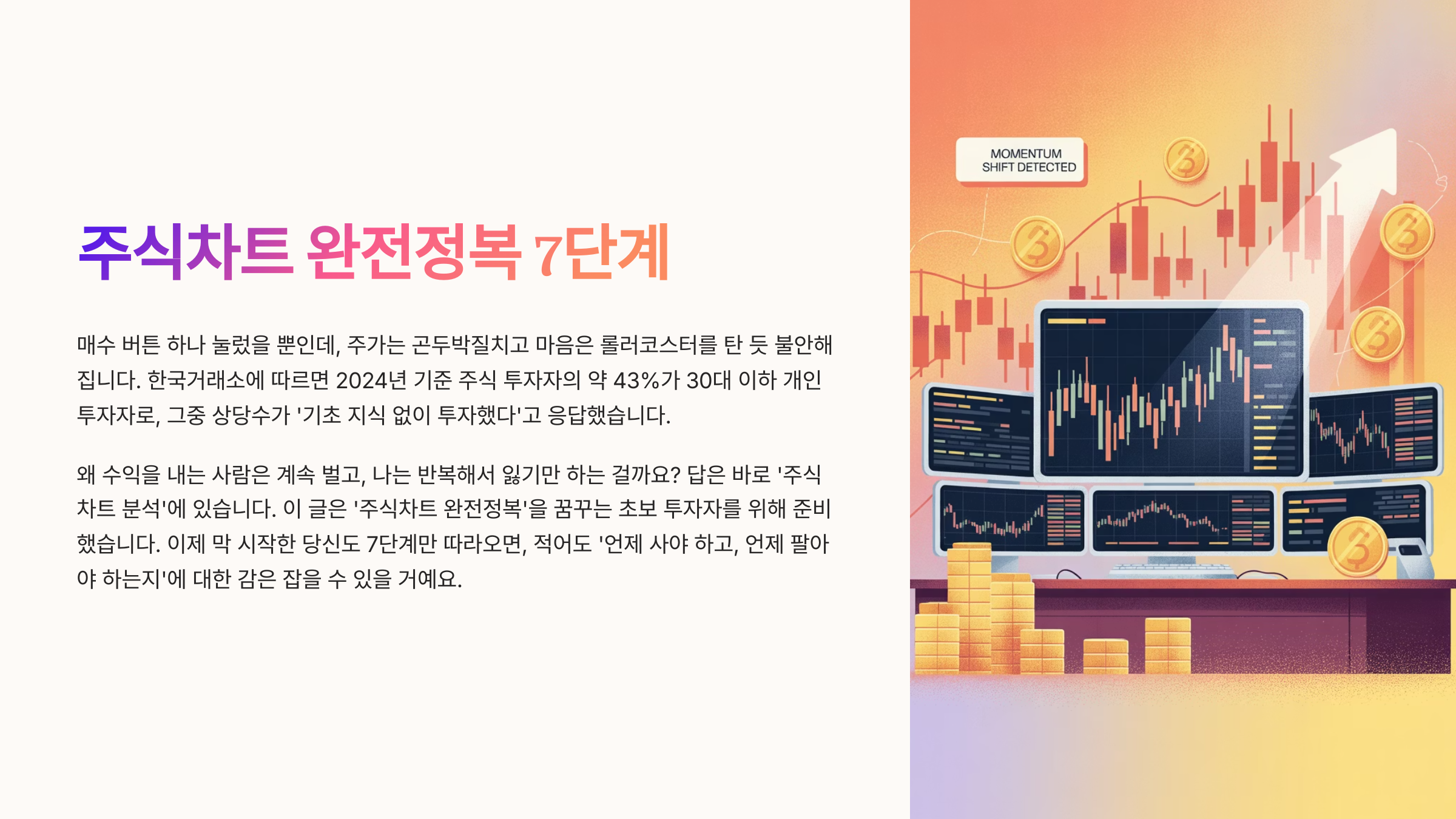 이 글은 ‘주식차트 완전정복’을 꿈꾸는 초보 투자자를 위해 준비했습니다. 이제 막 시작한 당신도 7단계만 따라오면, 적어도 ‘언제 사야 하고, 언제 팔아야 하는지’에 대한 감은 잡을 수 있을 거예요. 봉차트, 이동평균선, 거래량, 지지선/저항선 같은 용어들이 더 이상 낯설지 않게 만들어 드릴게요.