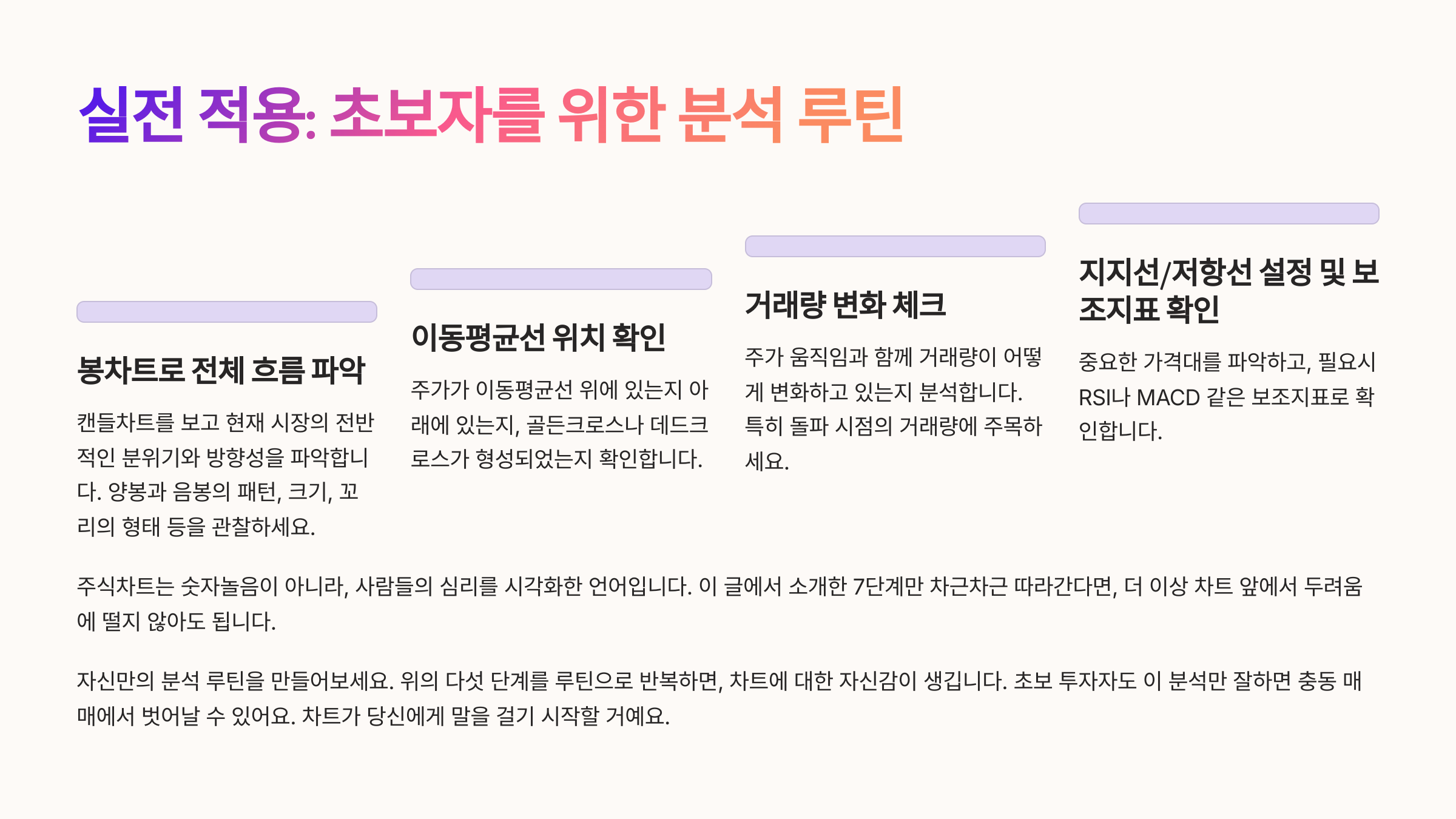 이 다섯 단계를 루틴으로 반복하면, 차트에 대한 자신감이 생깁니다. 초보 투자자도 이 분석만 잘하면 충동 매매에서 벗어날 수 있어요.