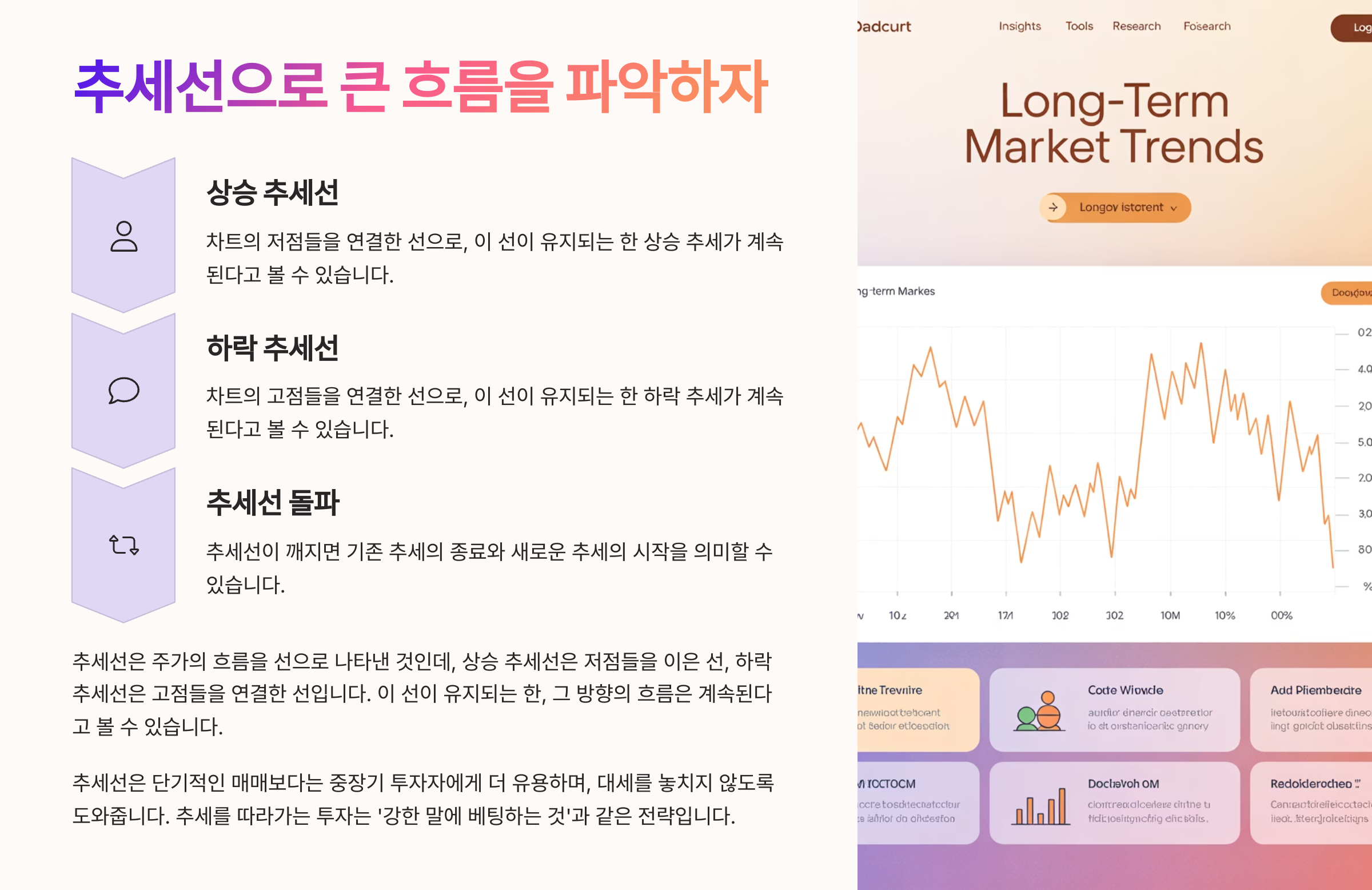 추세선은 단기적인 매매보다는 중장기 투자자에게 더 유용하며, 대세를 놓치지 않도록 도와줍니다.
