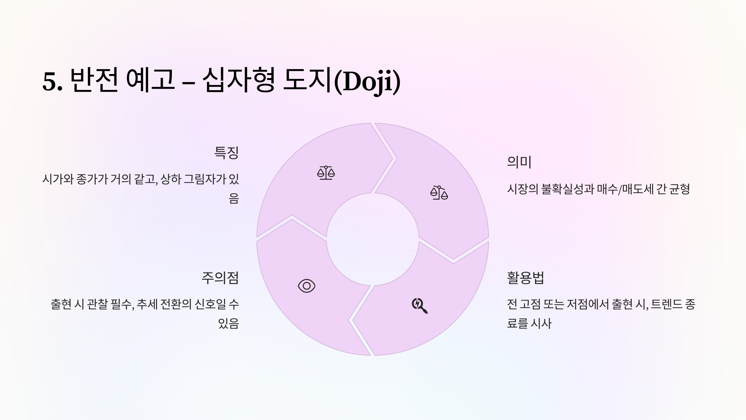 - 활용법: 전 고점 또는 저점에서 출현 시, 트렌드 종료를 시사할 수 있어 관찰 필수