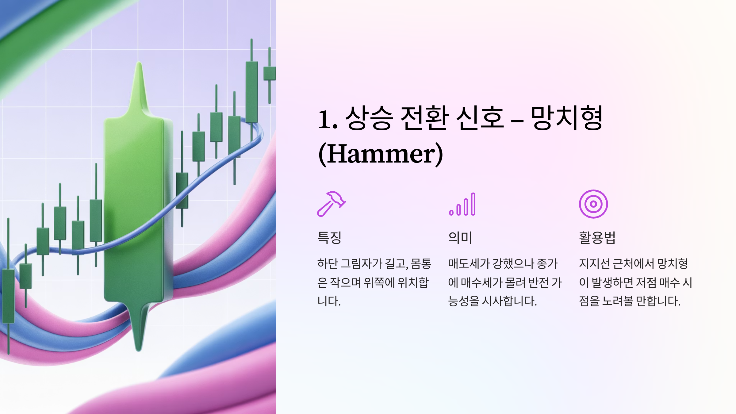 - 활용법: 지지선 근처에서 망치형이 발생하면 저점 매수 시점을 노려볼 만함