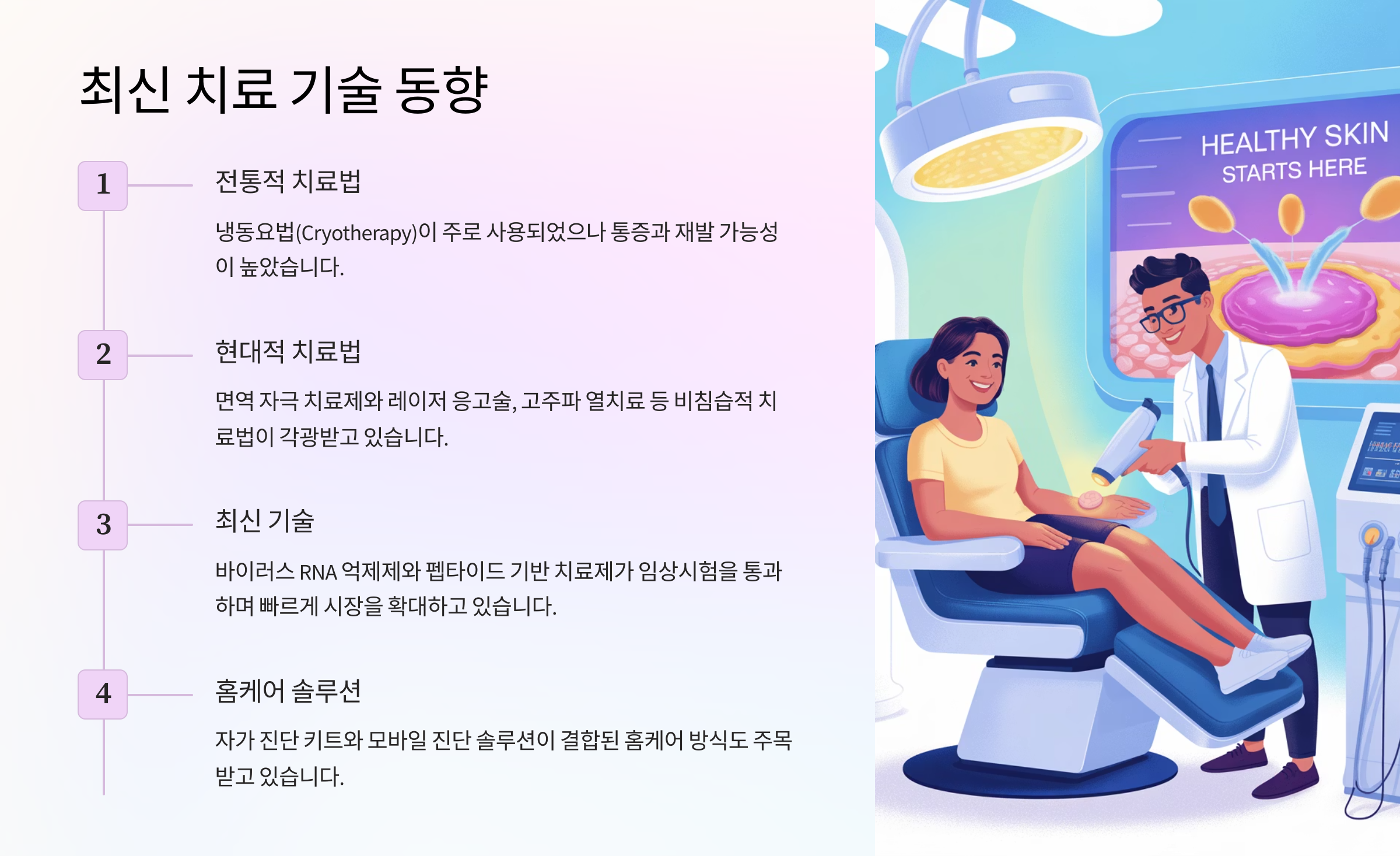 전통적인 냉동요법(Cryotherapy) 외에도 면역 자극 치료제와 레이저 응고술, 고주파 열치료 등 비침습적 치료법이 각광받고 있습니다.