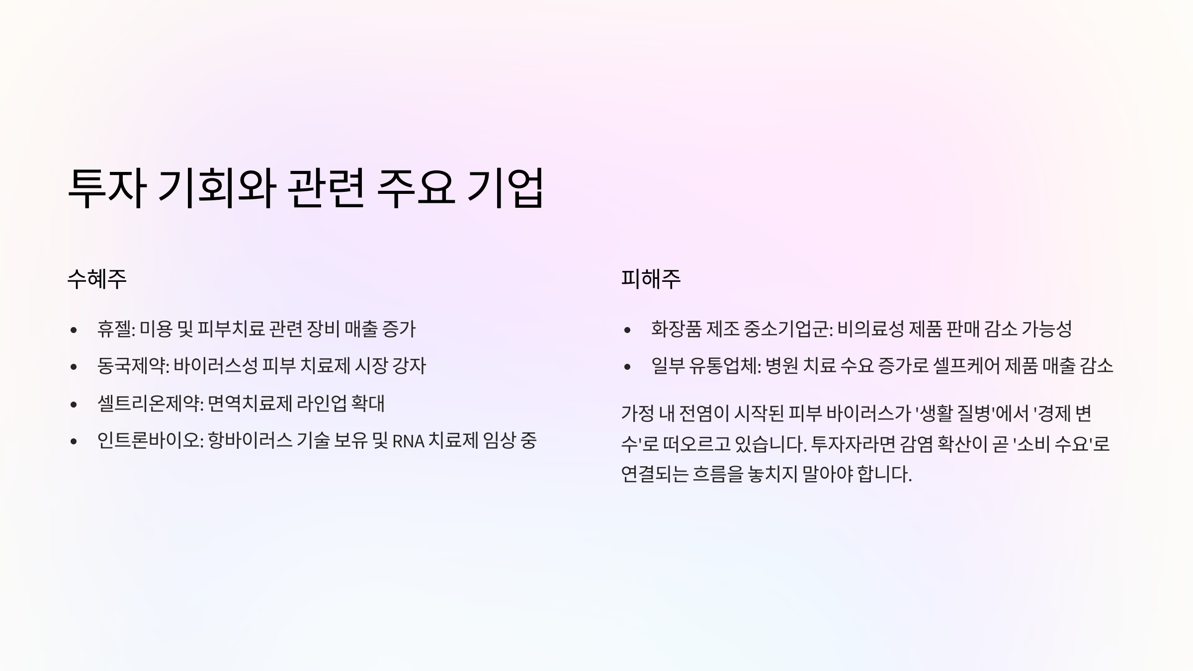가정 내 전염이 시작된 피부 바이러스가 ‘생활 질병’에서 ‘경제 변수’로 떠오르고 있습니다. 투자자라면 감염 확산이 곧 ‘소비 수요’로 연결되는 흐름을 놓치지 말아야 합니다.
