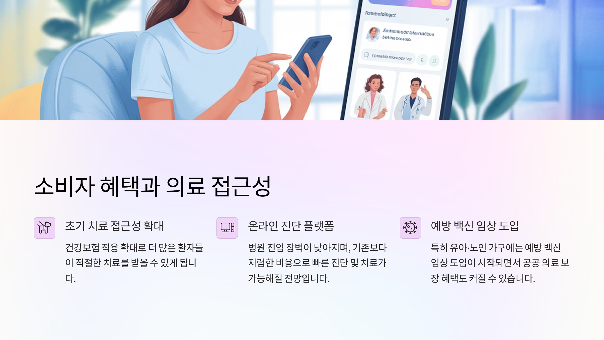 가장 실질적인 혜택은 초기 치료 접근성 확대와 건강보험 적용 확대입니다. 또한 온라인 진단 플랫폼을 통해 병원 진입 장벽이 낮아지며, 기존보다 저렴한 비용으로 빠른 진단 및 치료가 가능해질 전망입니다.
