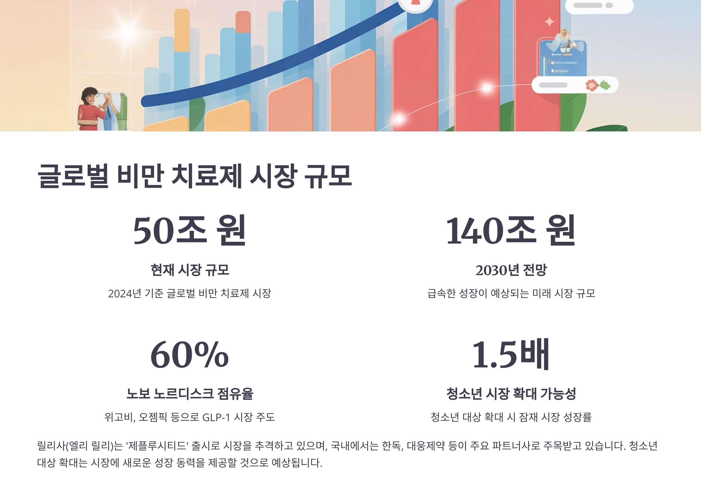 글로벌 비만 치료제 시장은 현재 약 50조 원(2024 기준)이며, 2030년에는 140조 원 이상으로 성장할 전망이다.