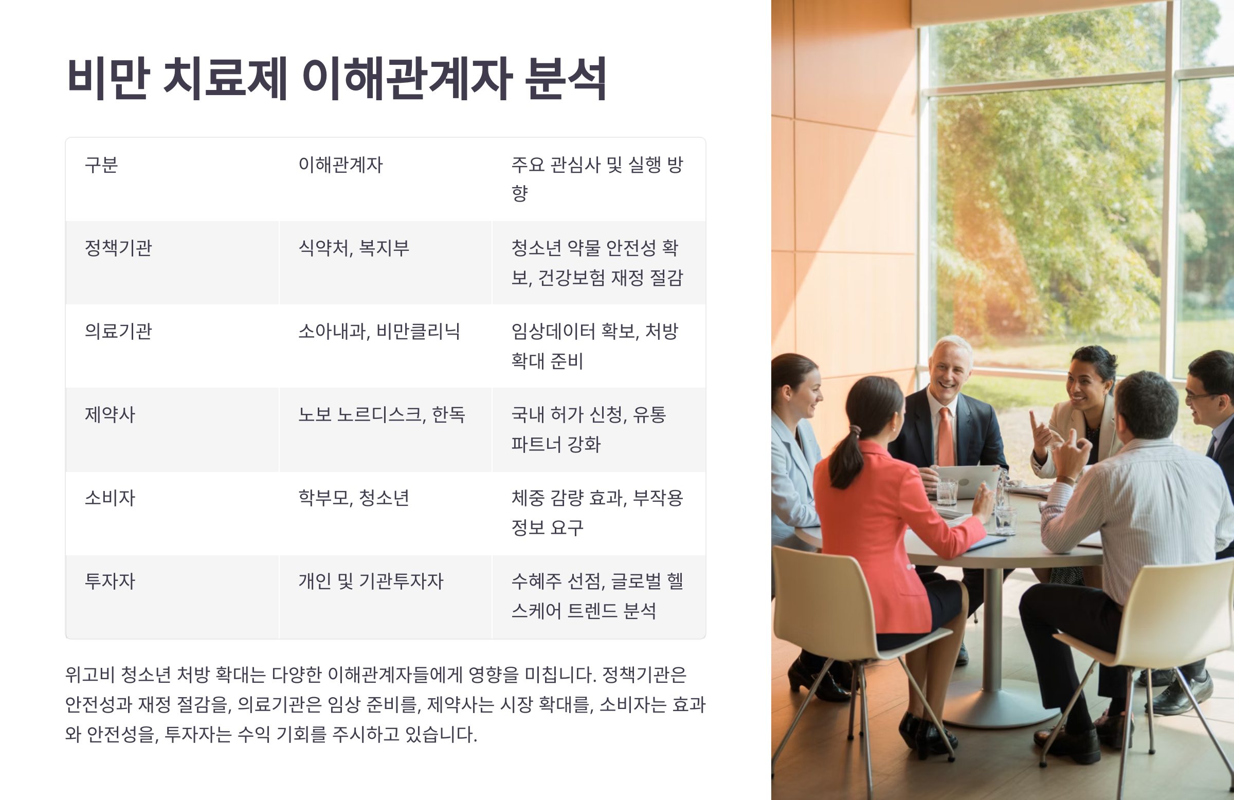 | ❌ 피해주 | 다이어트 식품 업체 | 약물 치료 확산 시 기존 시장 잠식 가능성 |