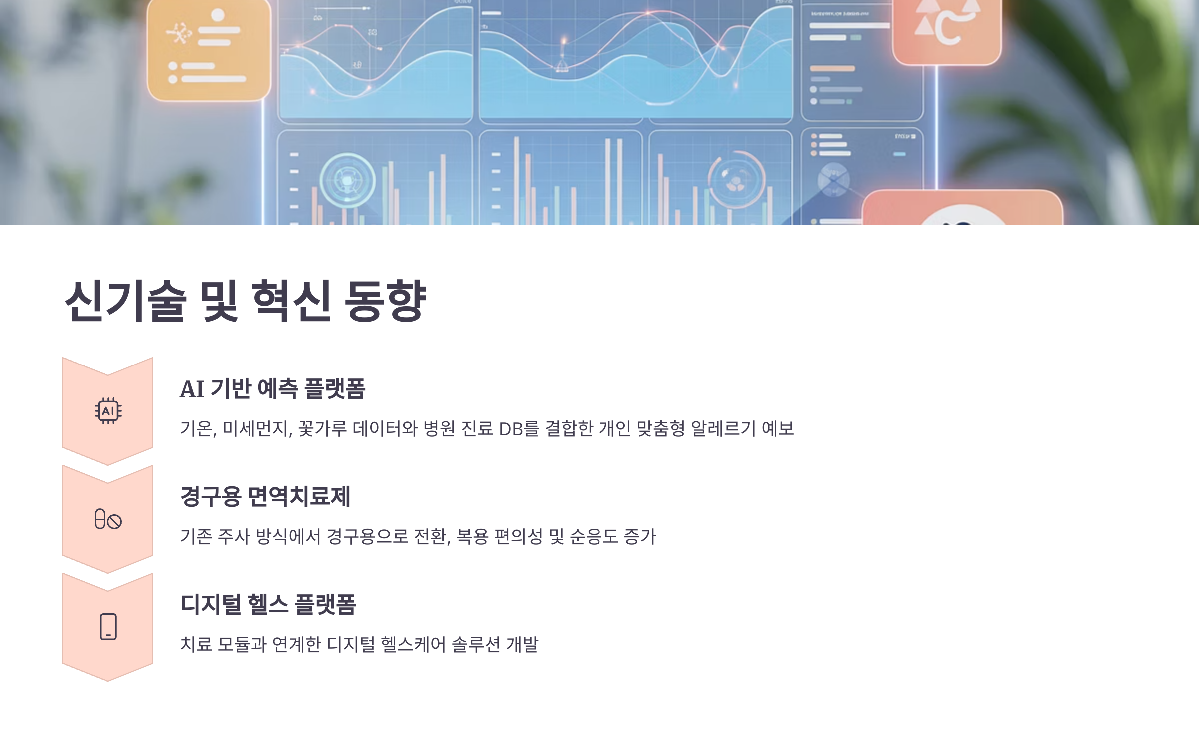 - 개인 맞춤형 치료 서비스: 알레르기 예측 앱, AI 기반 진단으로 진단 정확도 향상