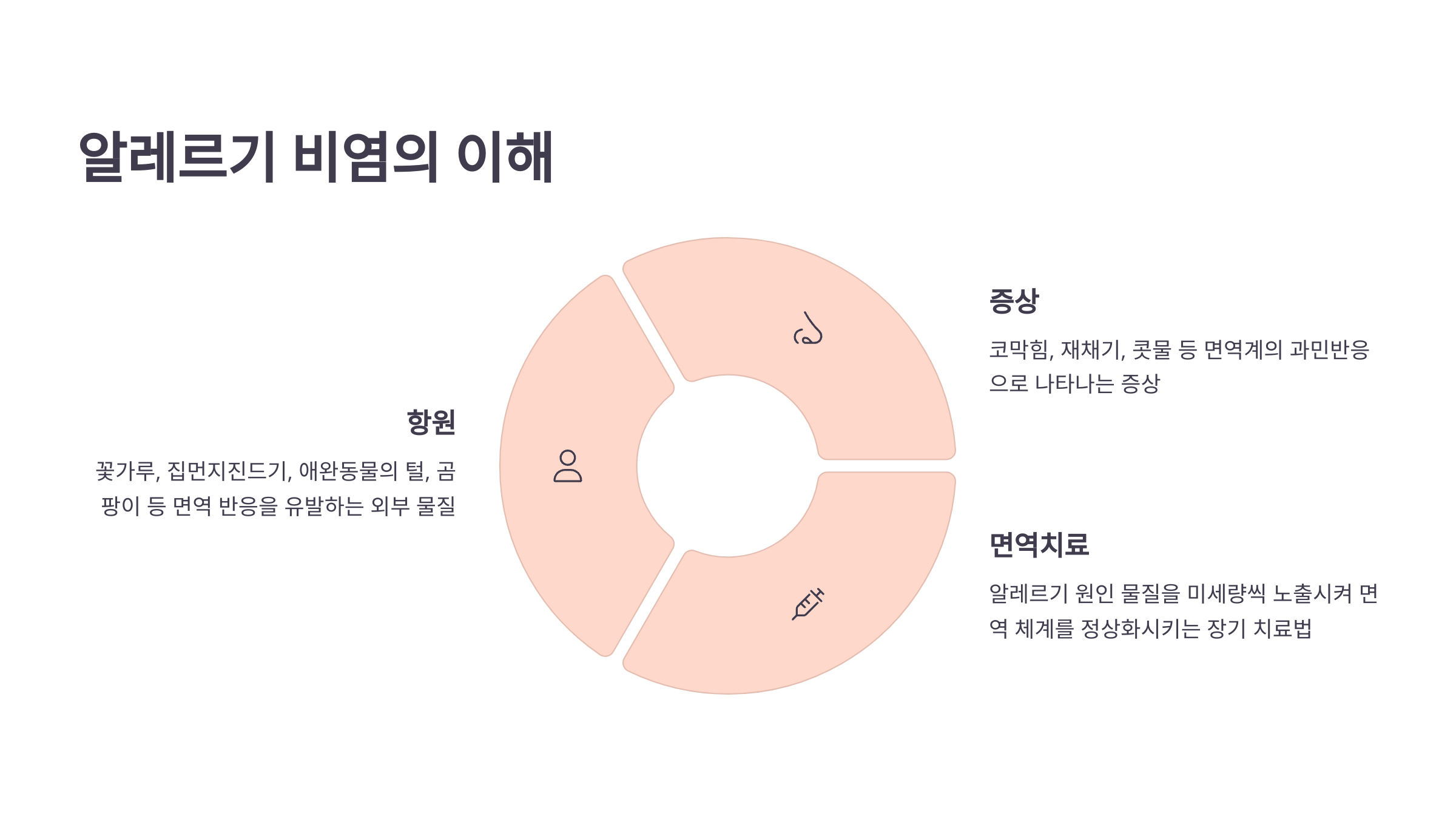 - 항원: 면역 반응을 유발하는 외부 물질. 주요 항원으로는 꽃가루, 집먼지진드기, 애완동물의 털, 곰팡이 등이 있습니다.