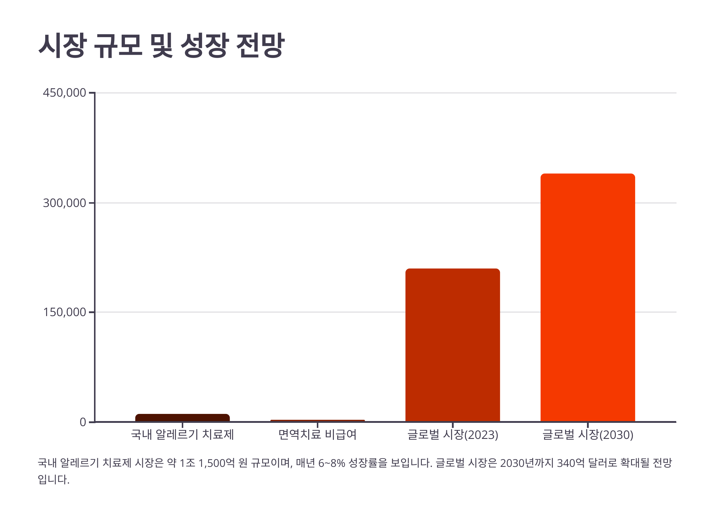 - 국내 알레르기 치료제 시장 규모는 약 1조 1,500억 원(2024년 기준)이며, 매년 6~8% 성장률을 보이고 있습니다.