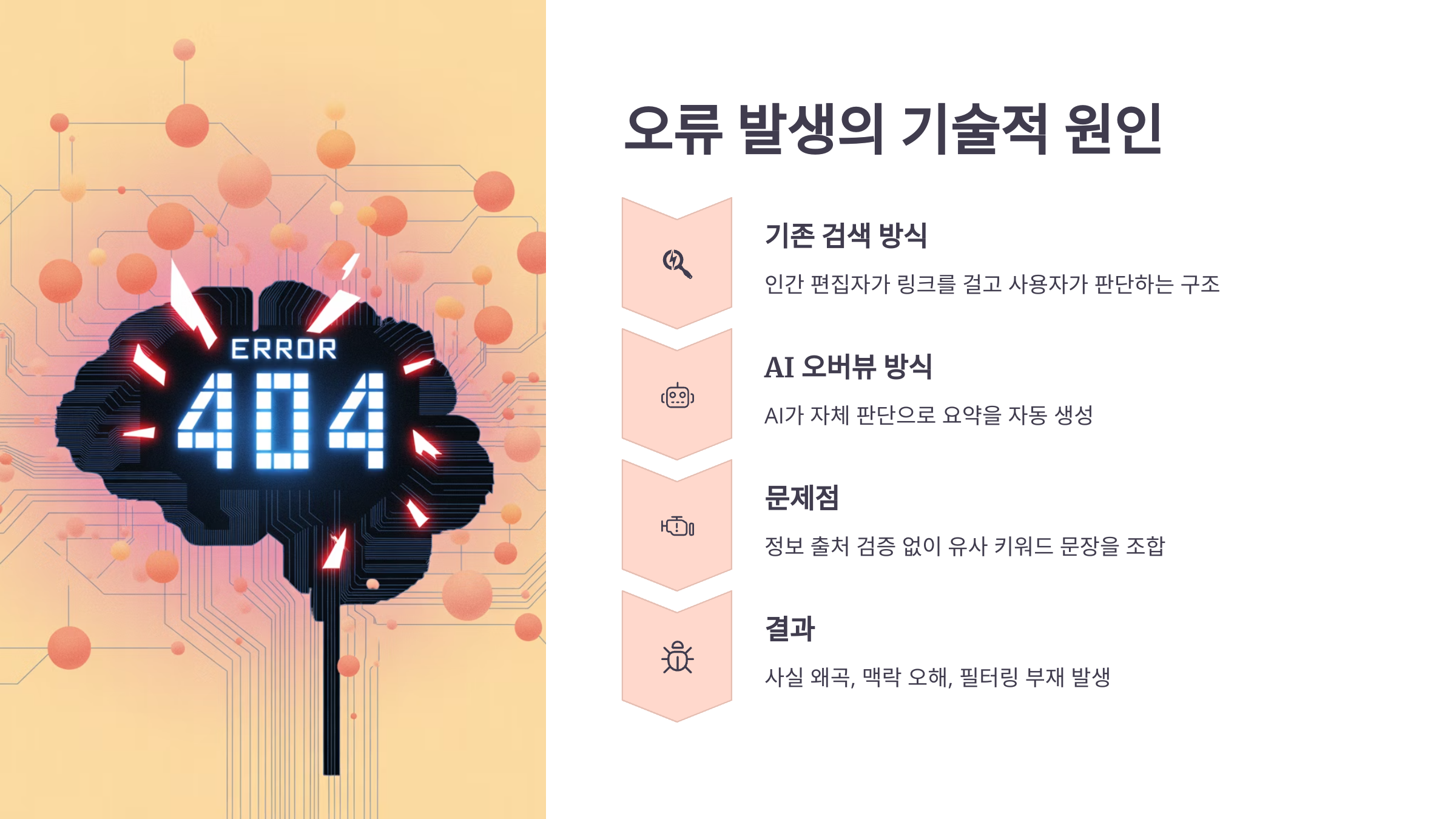 AI 오버뷰는 ‘검색의 미래’로 불릴 만큼 기대를 받았지만, 기술적으로는 완벽하지 않습니다. 기존 검색은 인간 편집자가 링크를 걸고 사용자가 판단하는 구조지만, AI 오버뷰는 자체 판단으로 요약을 자동 생성합니다.