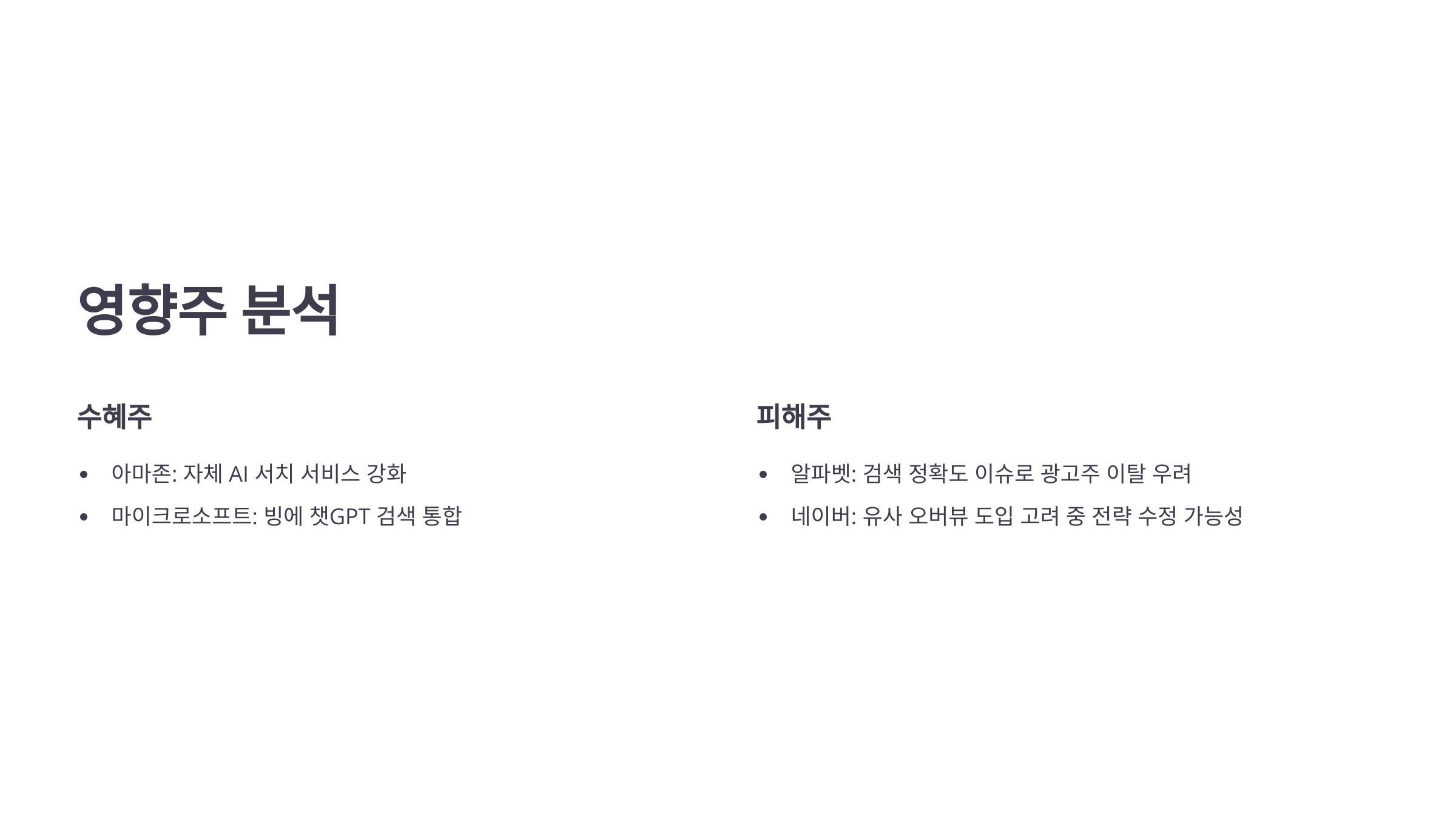 - 마이크로소프트(MS): 빙(Bing)에 챗GPT 검색 통합, 정확도·신뢰도 이슈에서 상대적 강점 부각