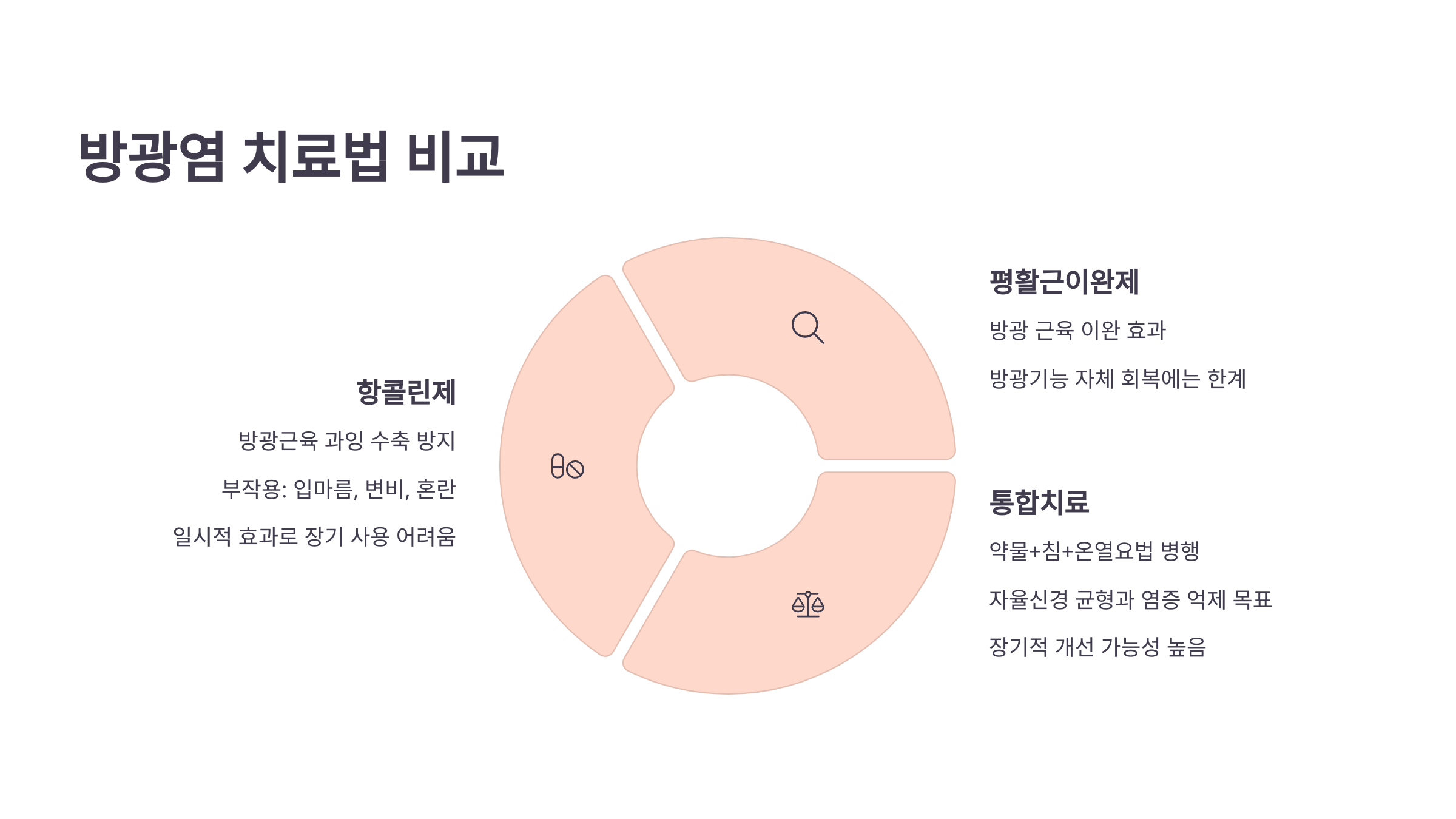 기존의 치료는 '증상 완화'에 초점이 맞춰져 있었습니다. 반면 일중한의원의 방식은 자율신경계 조절, 면역력 회복, 방광 내 환경 개선에 집중합니다.